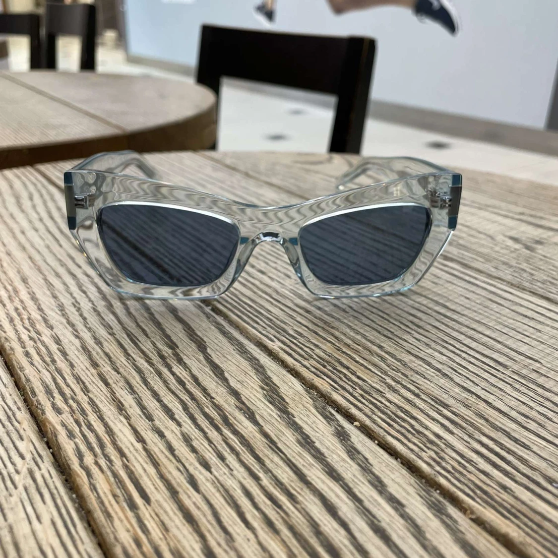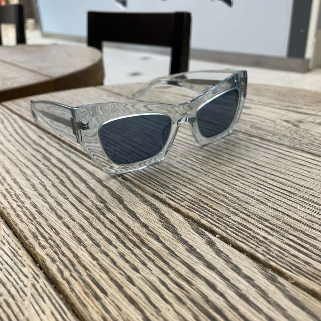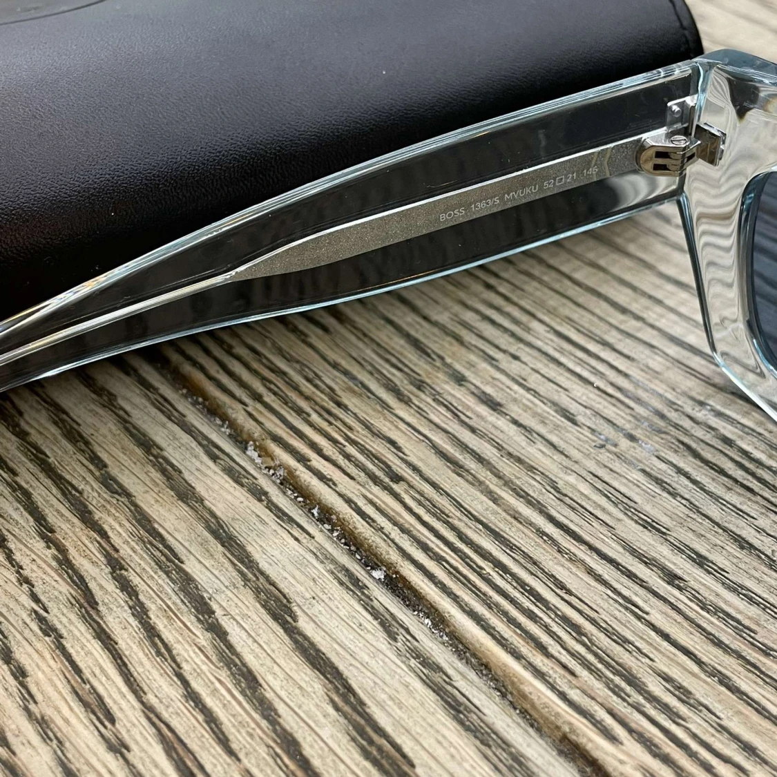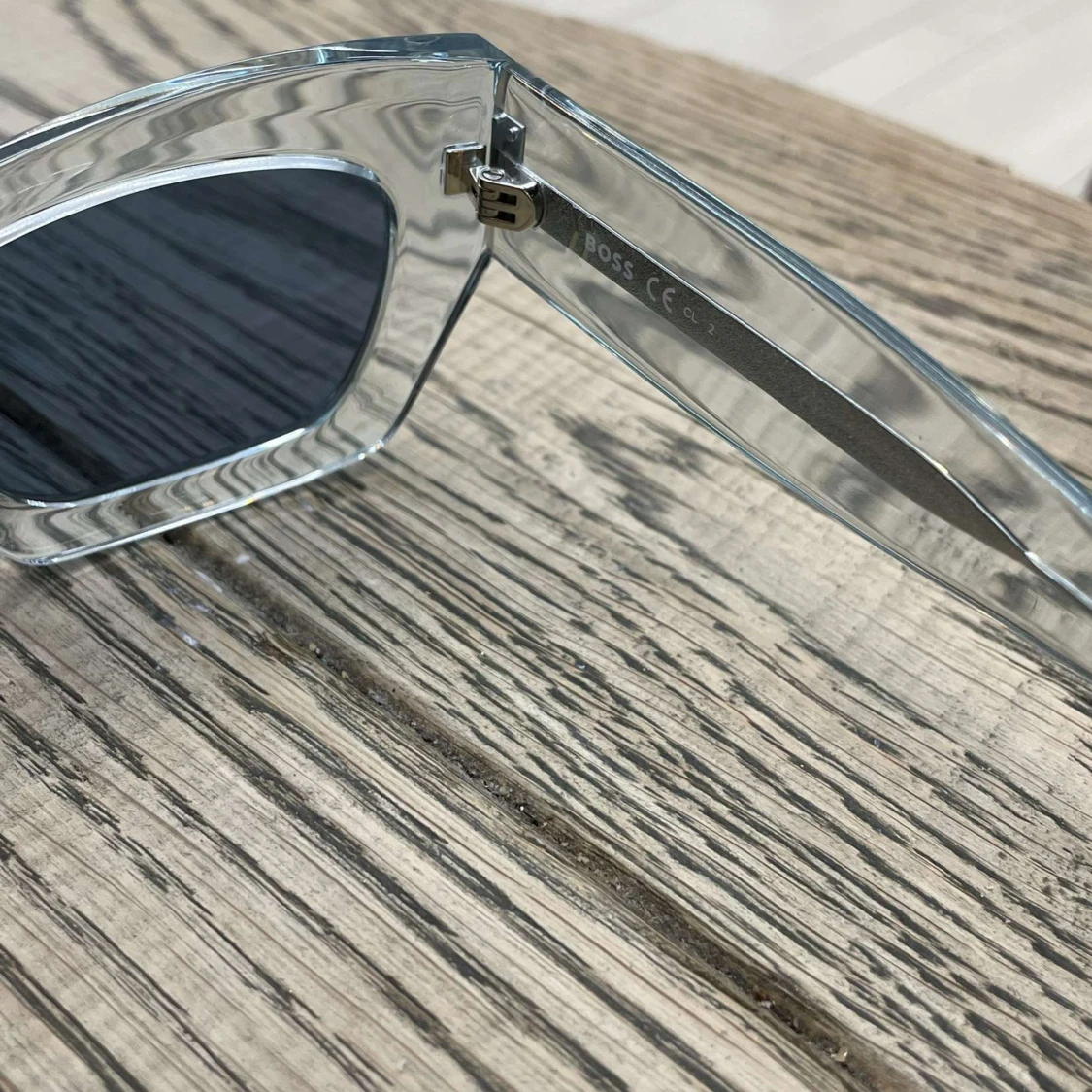 Snygga solglasögon från BOSS med transparent, ljusblå båge och mörka glas. Rektangulär form som ger en modern och cool look. Perfekt accessoar för att lyfta din stil.