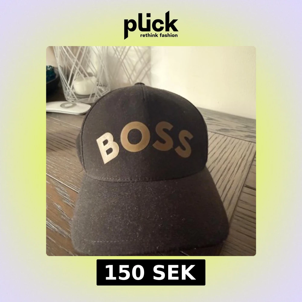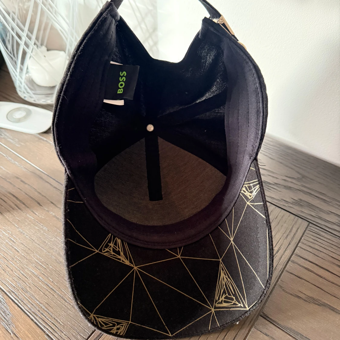 Svart keps från BOSS med stort guldigt BOSS-tryck framtill och geometriskt mönster i guld under skärmen. Justerbar rem med guldfärgad metallspänne där BOSS-loggan syns. Snygg och stilren design som sticker ut.