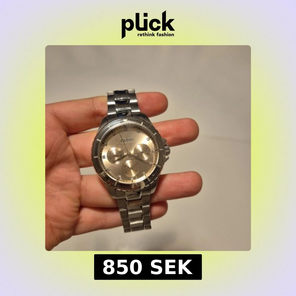 PROTECTIVE RUBBER LAYER IS STILL ON, NO SCRATCHES. New prive 2600 SEK. Säljer en snygg och klassisk klocka från BOSS med rund urtavla i champagnefärg och tre mindre subdials. Klockan har en robust länkad armlänk i silverfärgat metall och tydliga indexmarkeringar med små stenar. Perfekt accessoar för dig som gillar stilren design.
