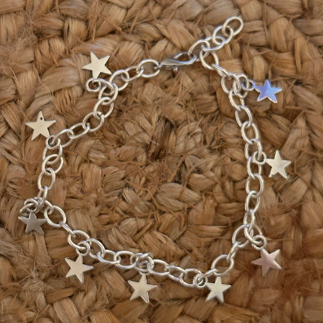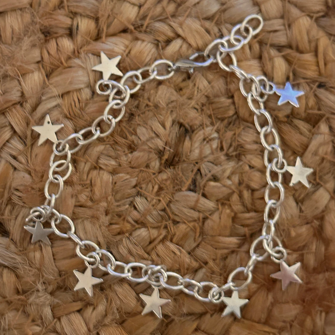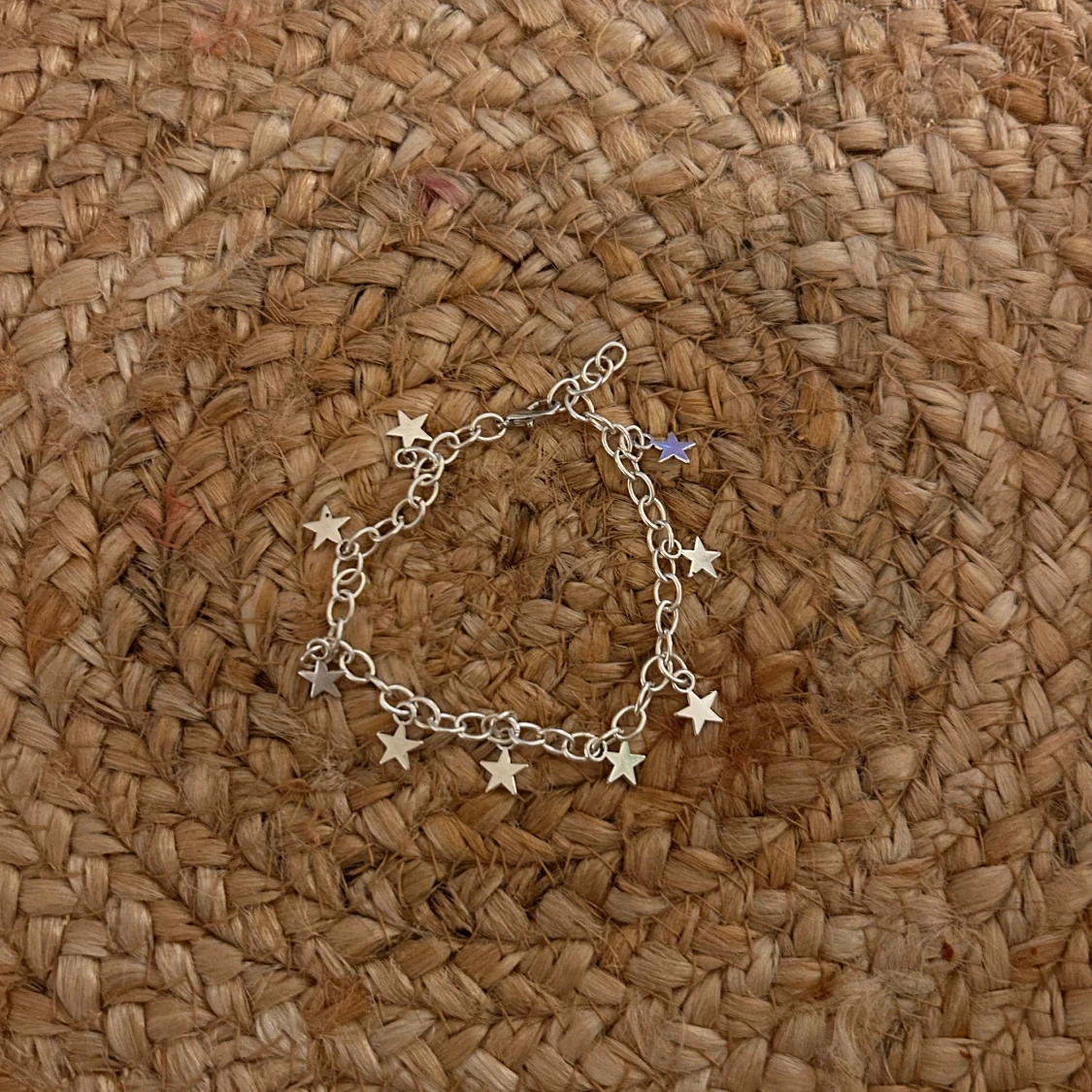 Snyggt silverarmband med små stjärnor som hänger längs kedjan. Perfekt för att ge en glittrig touch till din outfit. Armbandet är i ett mycket bra skick och passar till både vardag och fest. Lätt att matcha med andra smycken för en komplett look. ✨