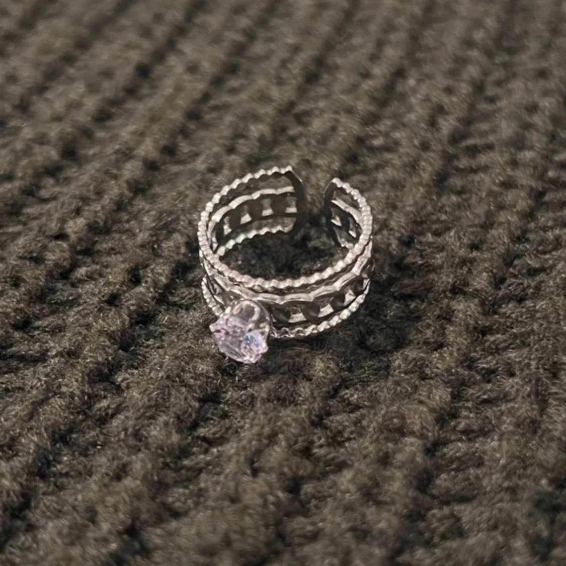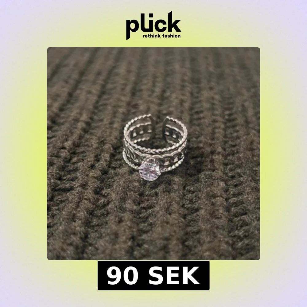 US storlek 7, diameter 17,3 mm, omkrets 54,4 mm. Denna sofistikerade ring har ett vackert flätat motiv som ramar in en gnistrande sten i mitten. Den justerbara designen gör den både bekväm och tidlös.