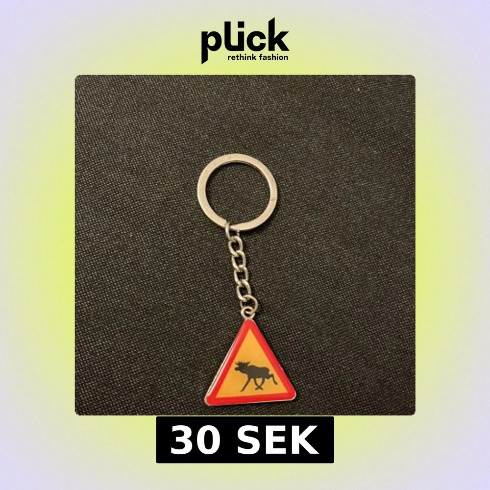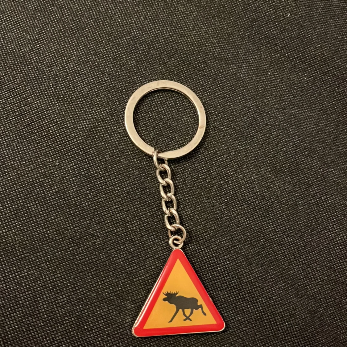 Säljer en rolig nyckelring med en trekantig älgvarningsskylt i rött och gult. Perfekt som accessoar till väskan eller nyckelknippan. Metallkedja och ring för enkel fastsättning. Jag köpte den för 50