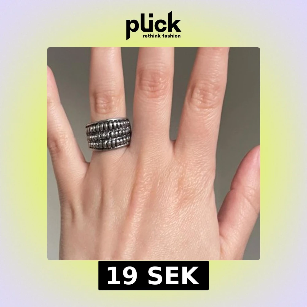 Säljer en chunky ring i silverfärg med tre rader av upphöjda, ovala detaljer som ger en cool och unik struktur. Ringen är bred och har en riktigt statement-look, perfekt för dig som gillar att sticka ut med dina accessoarer.