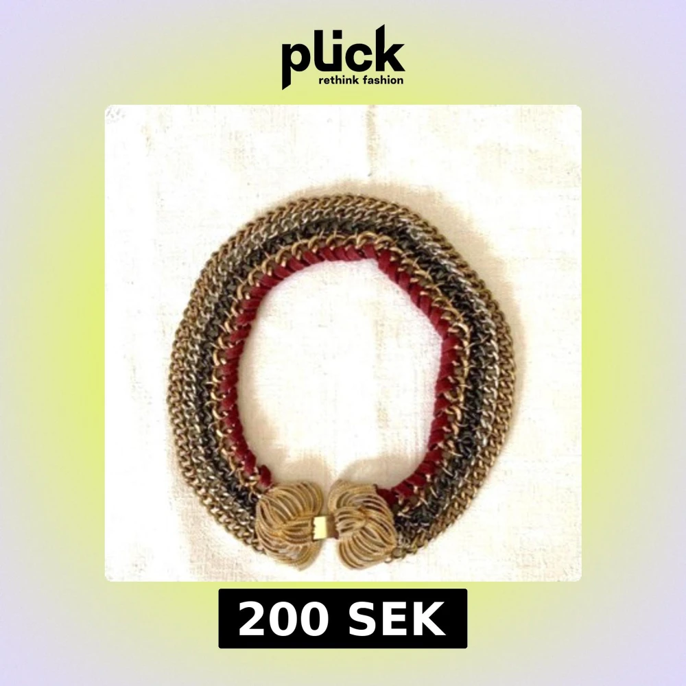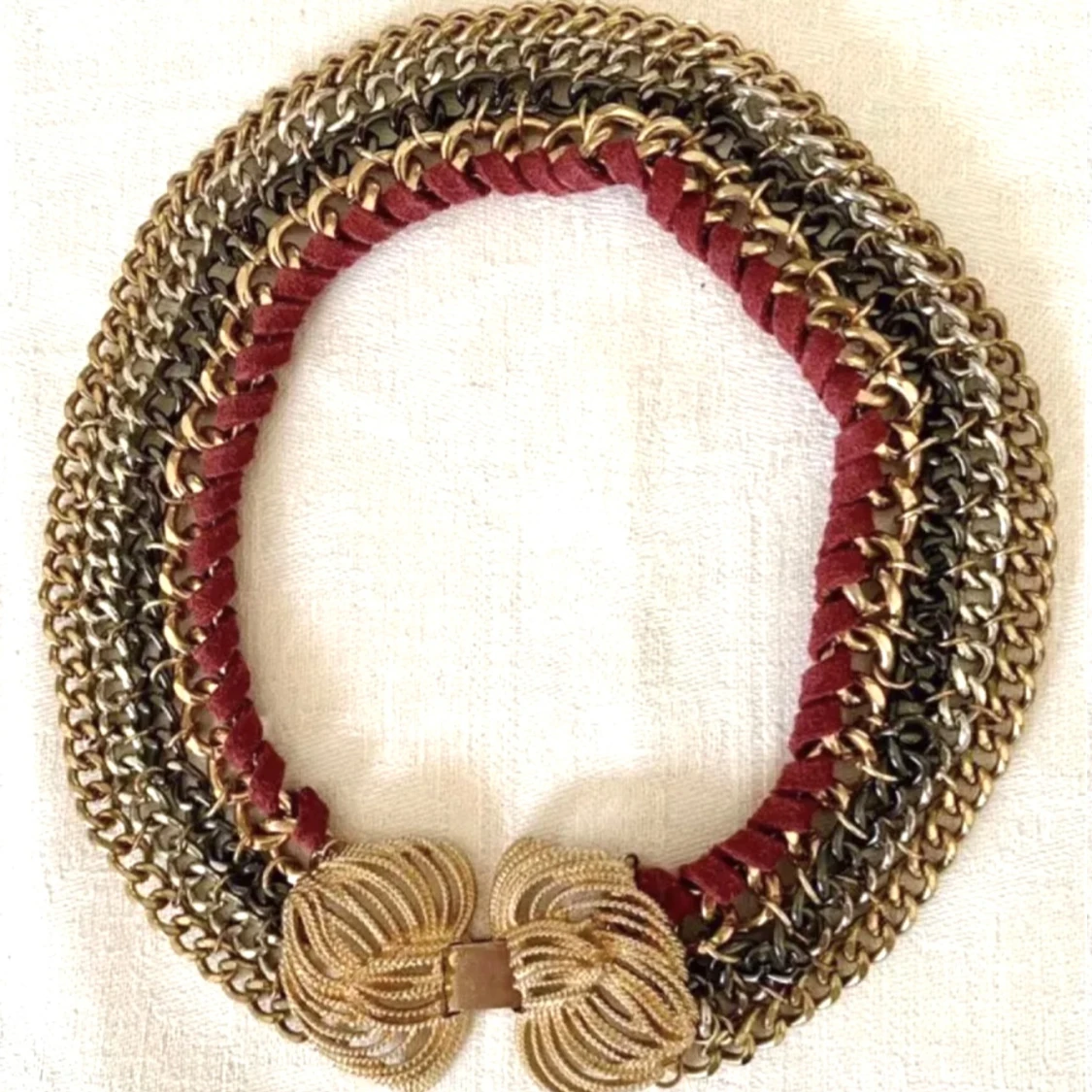 Unikt halsband med breda kedjor i guld och silver, flätat med vinrött band. Stängs med en dekorativ rosett i guldfärgad metall framtill. Statement piece som verkligen sticker ut och ger cool vibe till din outfit.