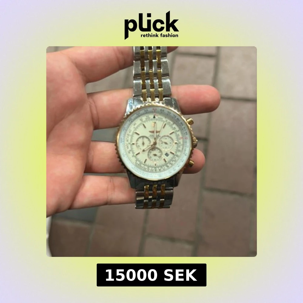 Snygg Breitling Navitimer herrklocka med kronograf och datum. Armbandet är i silver och guldtonad metall med klassisk länkdesign. Urtavlan är vit med flera subdials och detaljerade markeringar. Guldiga knappar och bezel ger en lyxig känsla. Perfekt för dig som gillar statement-accessoarer.