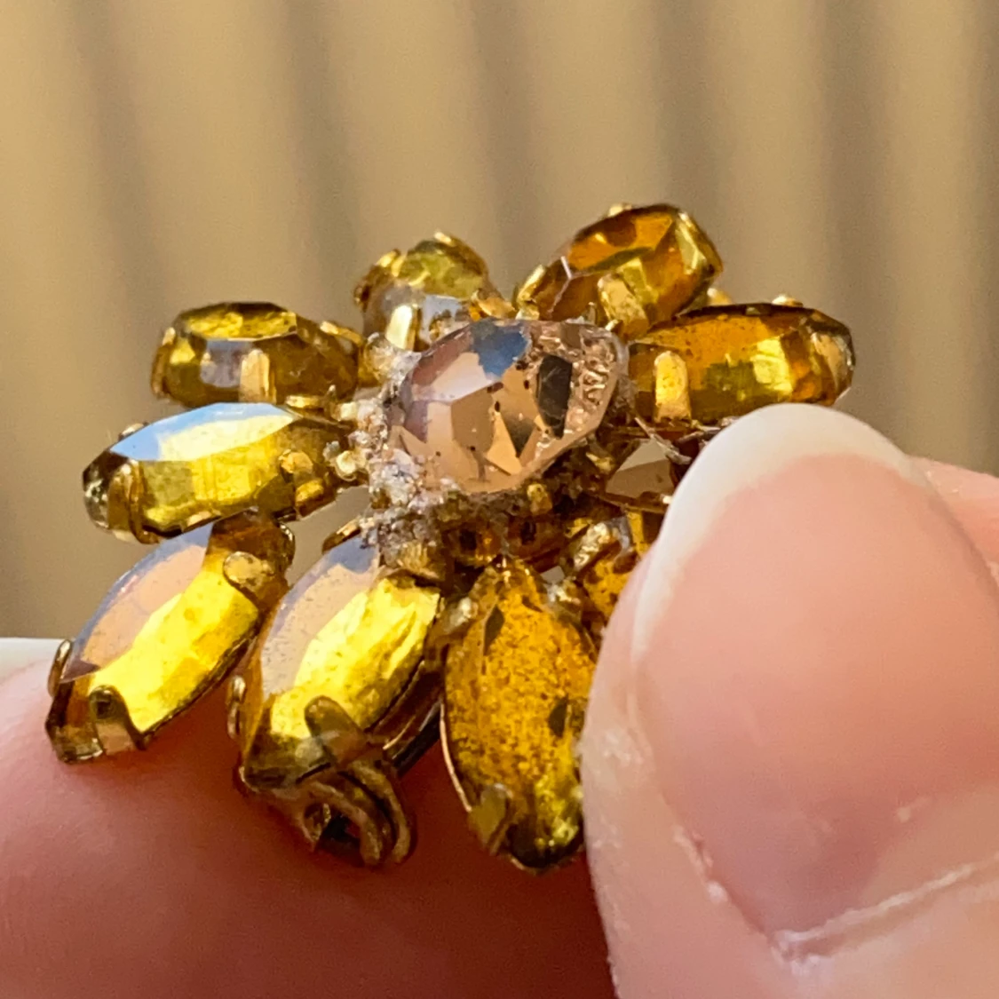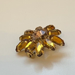 Vacker guldfärgad brosch med fasetterade rhinestones