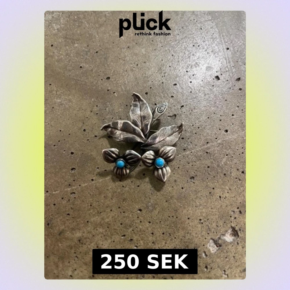 Unik brosch i form av blad och blommor, tillverkad i silver med detaljerade graveringar. Två blommor pryds av klara turkosa stenar i mitten. Broschen är ca 4-4,5cm lång och har en klassisk nål på baksidan. Perfekt för att ge din outfit en cool vintagekänsla.