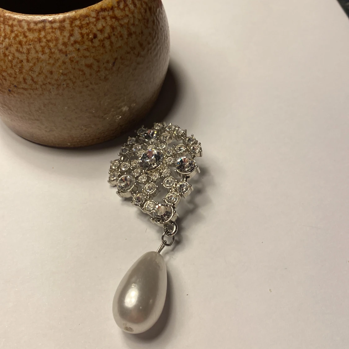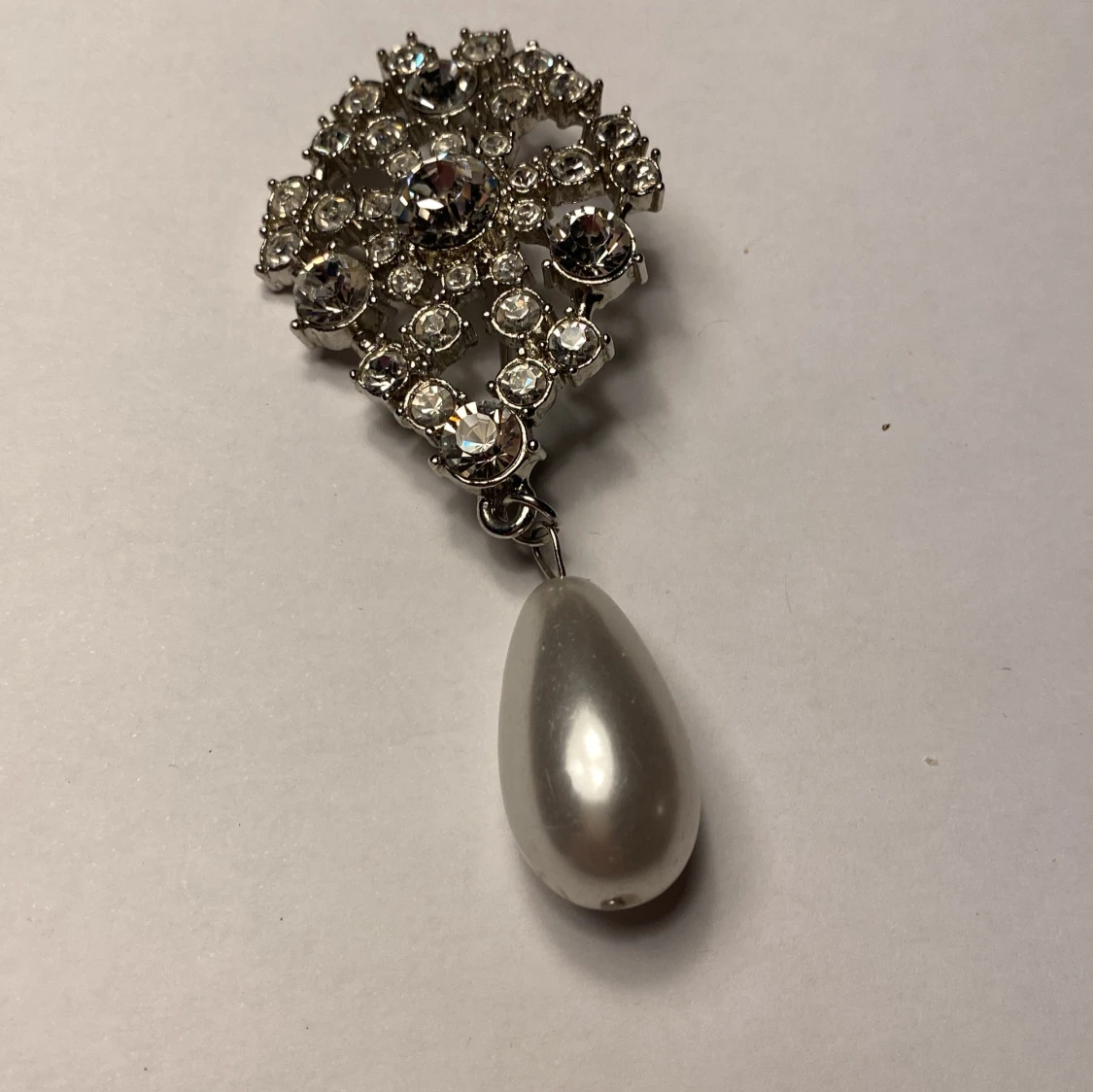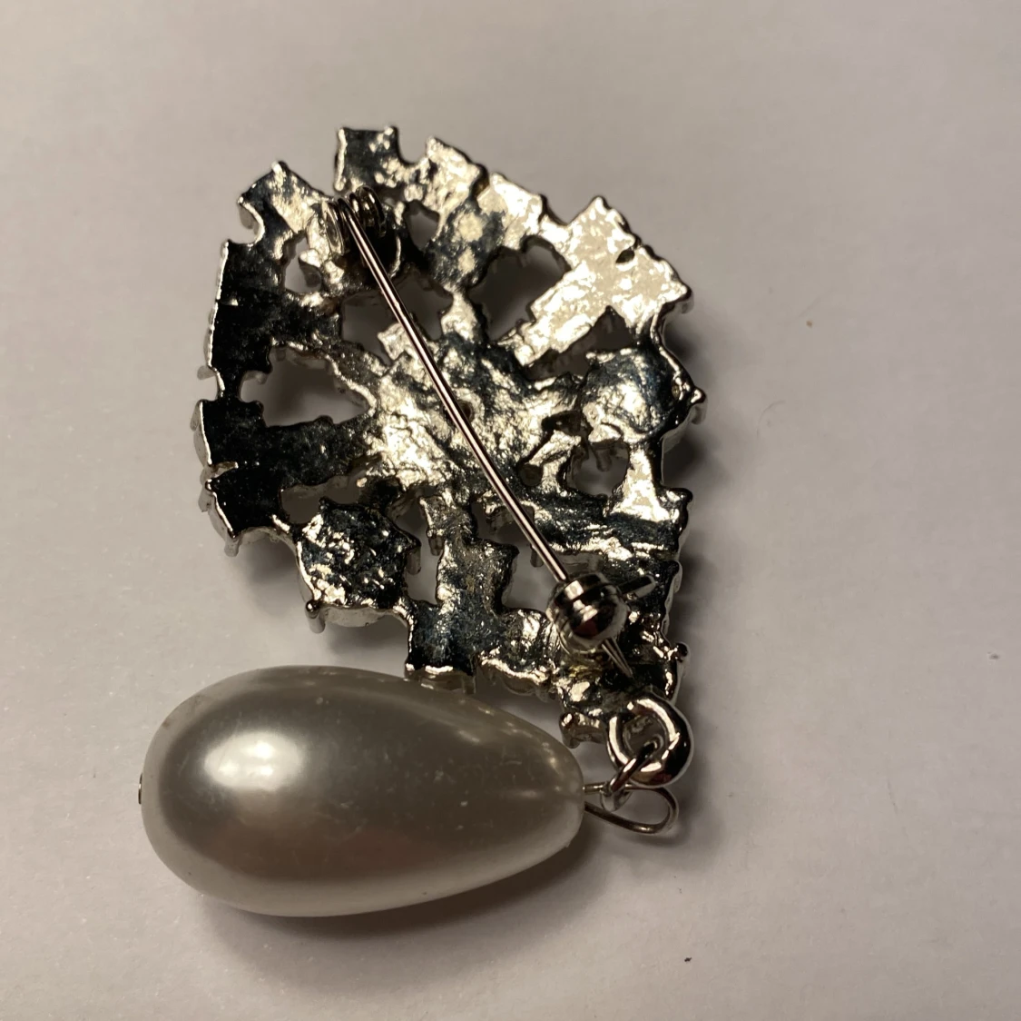 Snygg vintage brosch från USA i silverfärg med glittrande stenar och en stor pärldroppe. Perfekt för att ge en touch av elegans till din outfit. Fästes enkelt med en nål på baksidan.