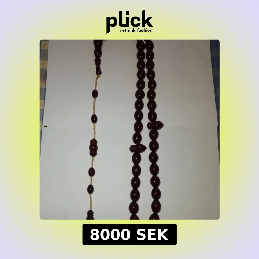 Säljer ett långt halsband med mörkbruna pärlor i olika former och storlekar. Halsbandet har en tunn guldfärgad kedja mellan vissa pärlor och dekorativa detaljer. Perfekt för dig som gillar unika accessoarer.