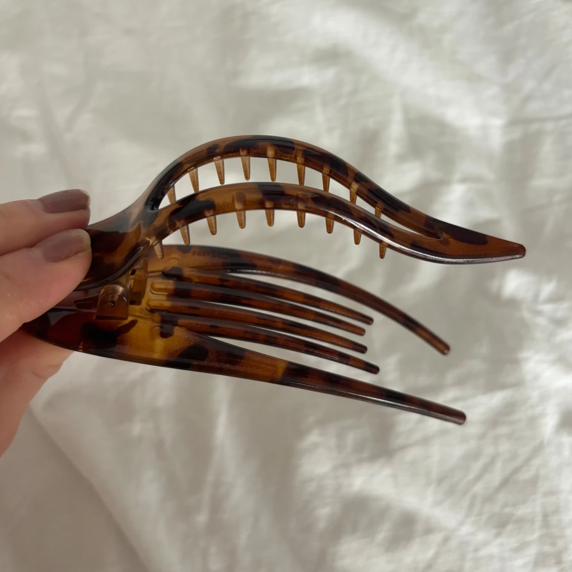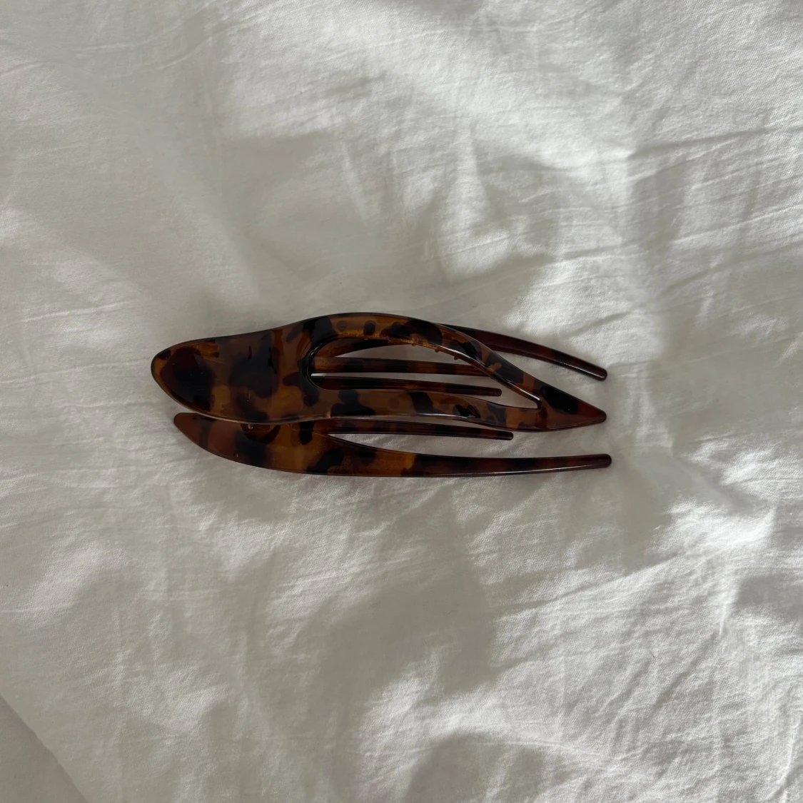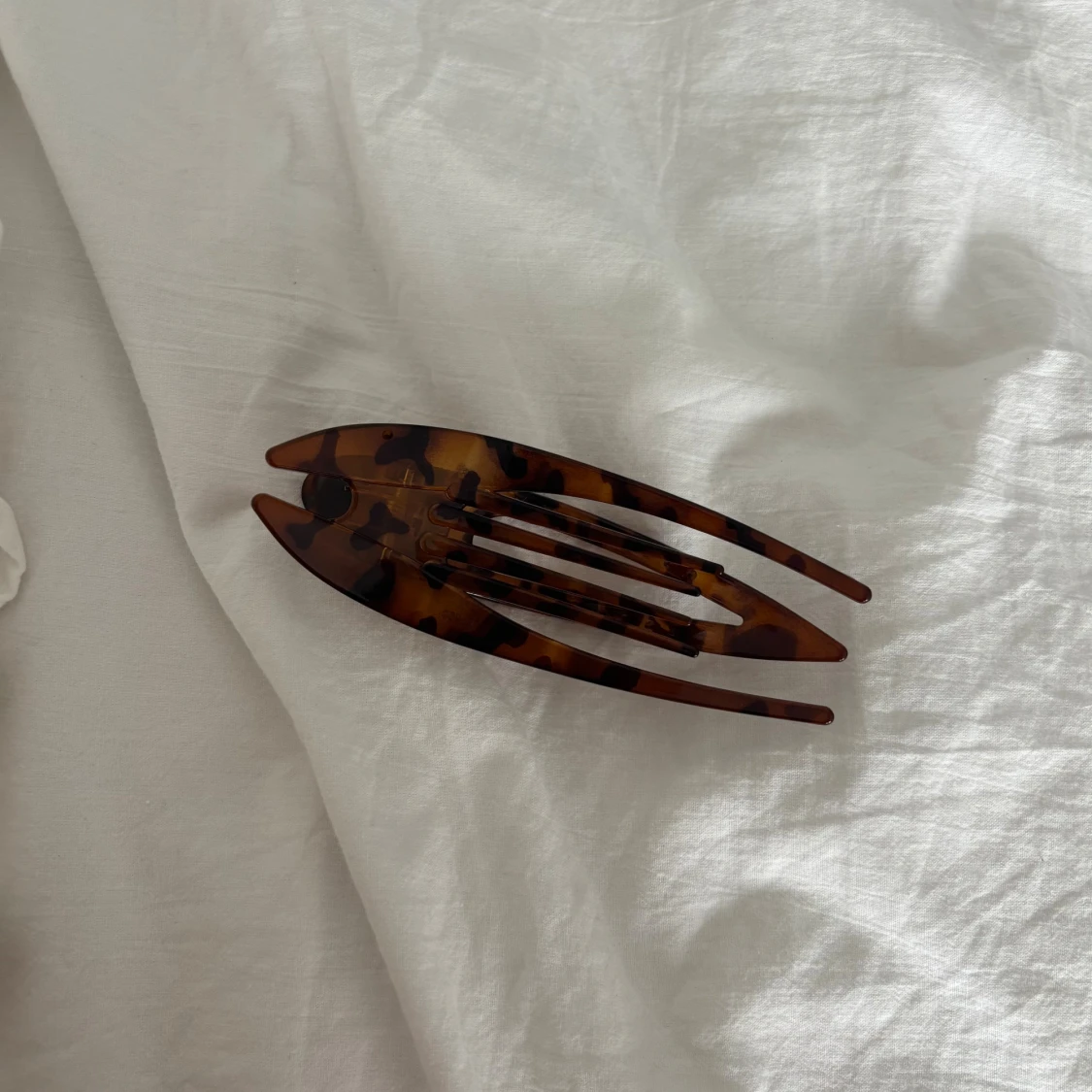 Snygg hårklämma i brun och svart leopardmönstrad plast. Klämman har en avlång, böjd form och är perfekt för att hålla upp håret på ett trendigt sätt. Passar dig som vill ha en cool accessoar till frisyren.