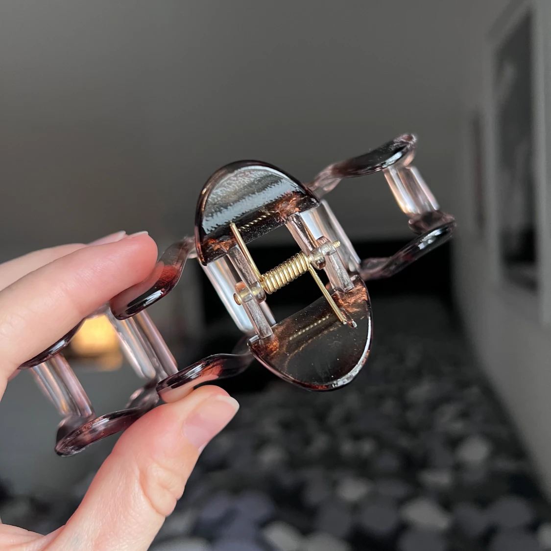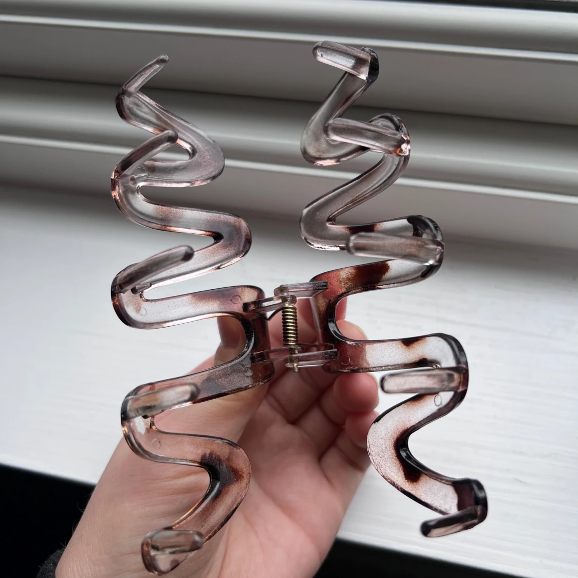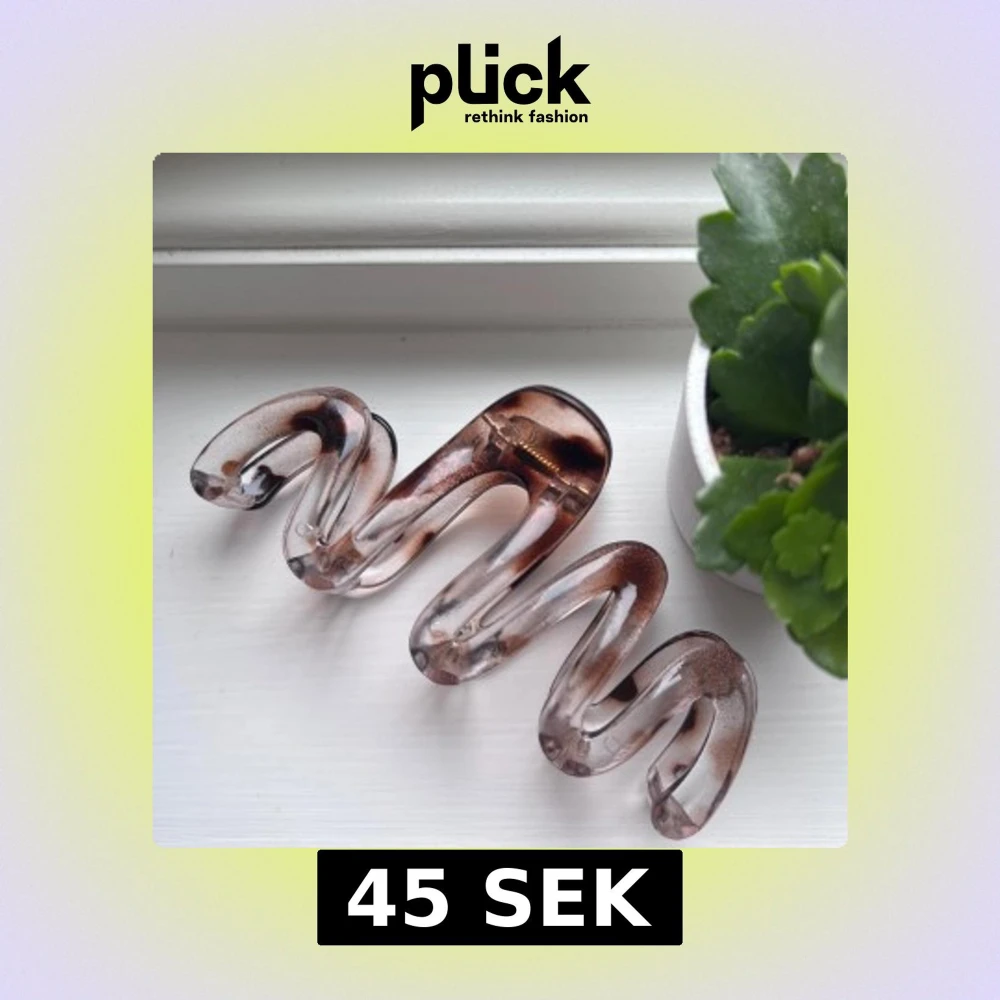 Snygg och unik hårklämma i en vågig form med en mix av bruna och genomskinliga nyanser. Perfekt för att hålla håret på plats med stil. Klämman har en robust metallfjäder för säker passform. Aldrig använd. Storlek: 13cm lång