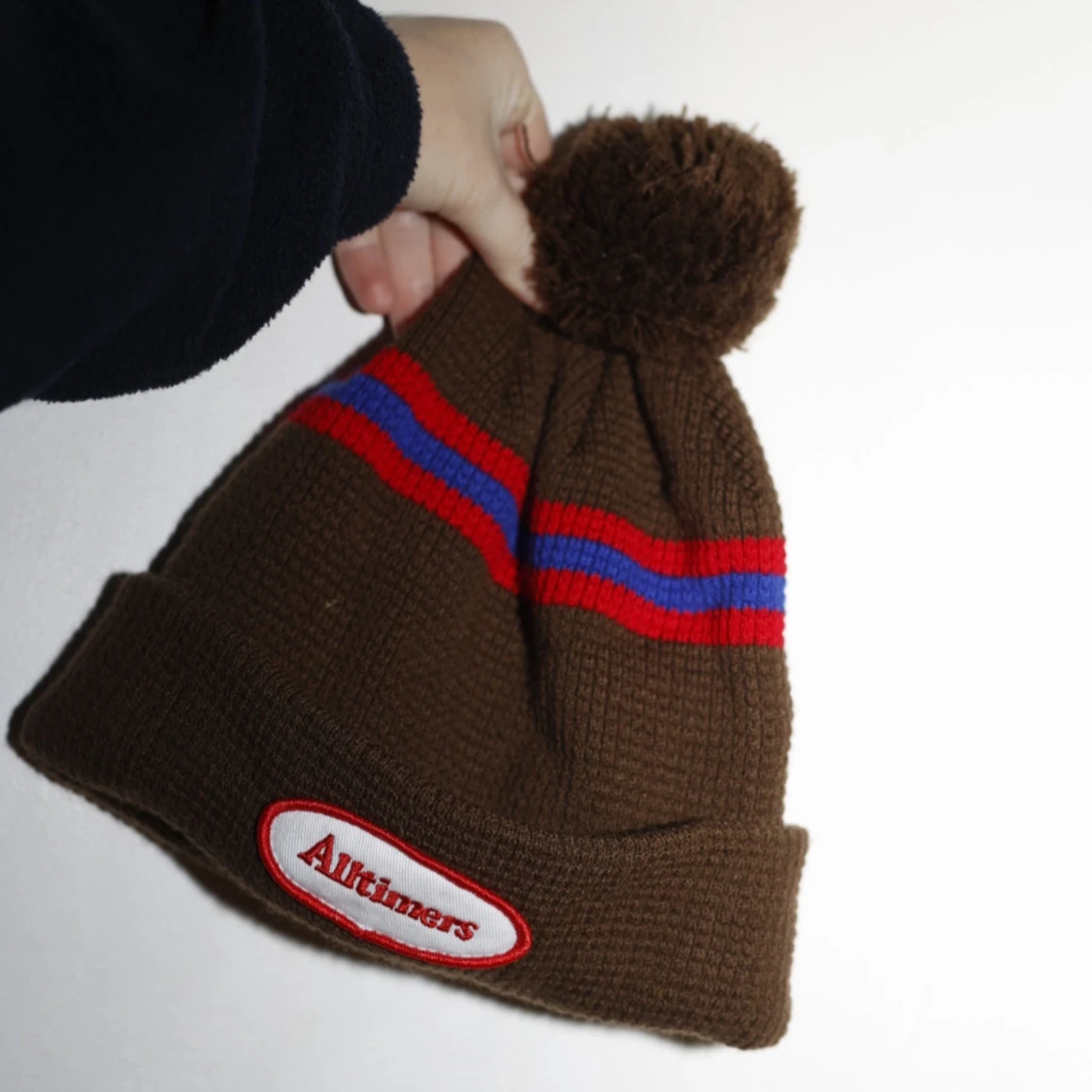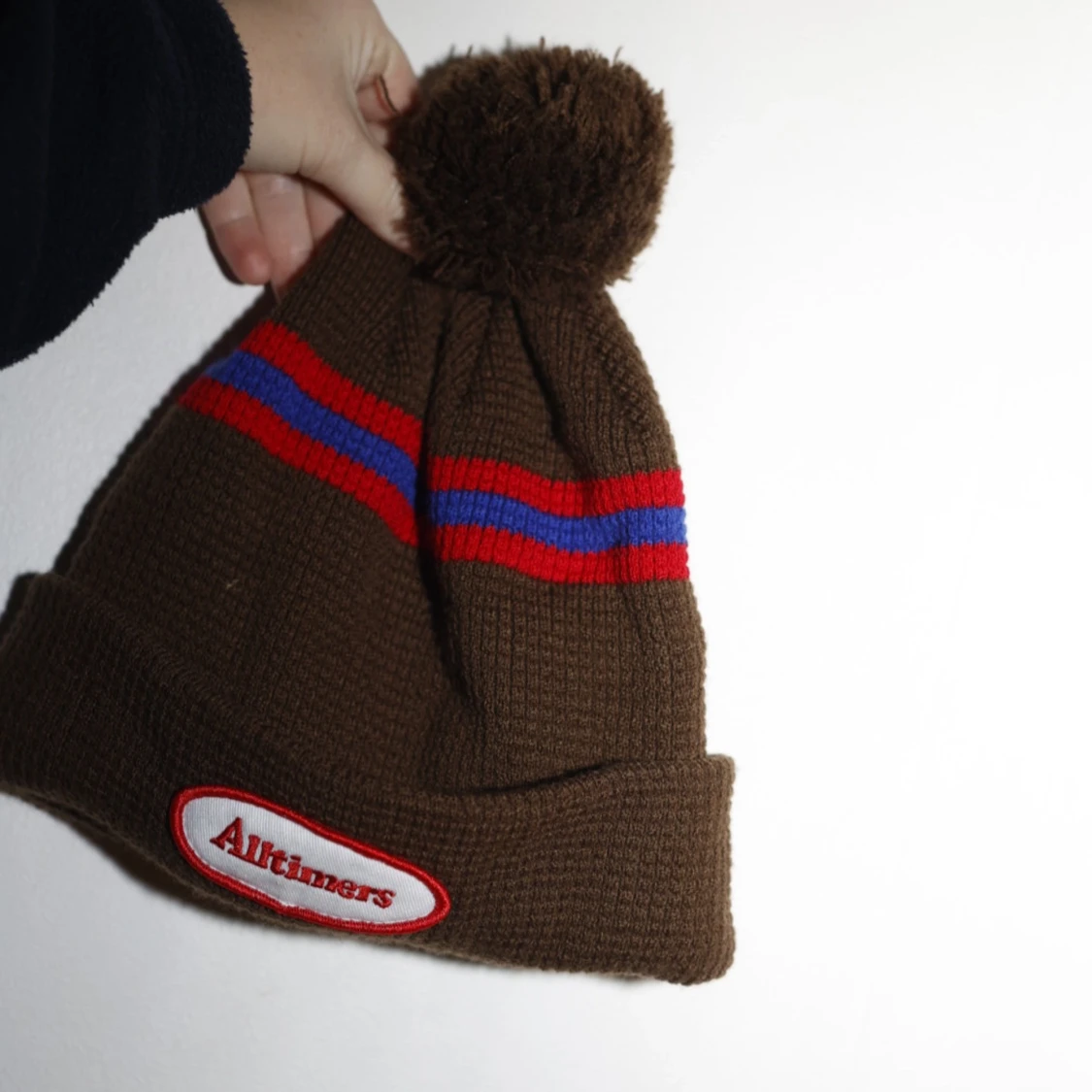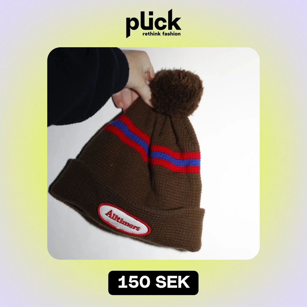 Säljer en snygg brun mössa från Alltimers med en stor tofs på toppen.