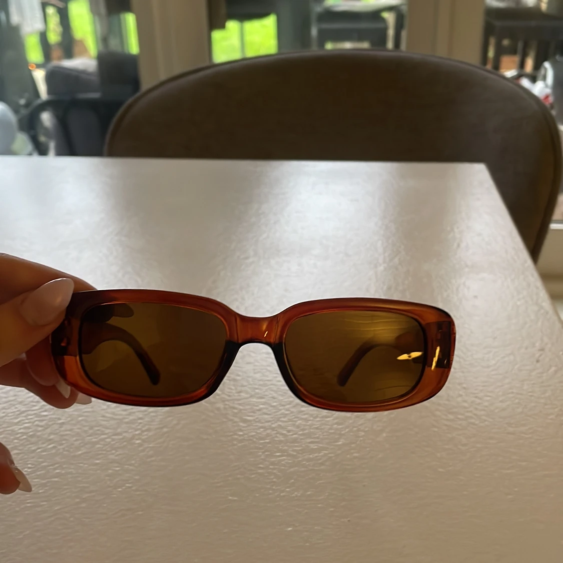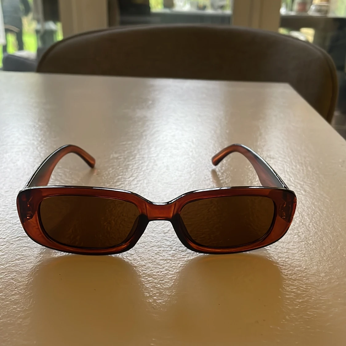 Snygga solglasögon med rektangulära bågar i brun plast. Glasen är tonade och bågarna har en klassisk, stilren design som passar till många olika outfits.