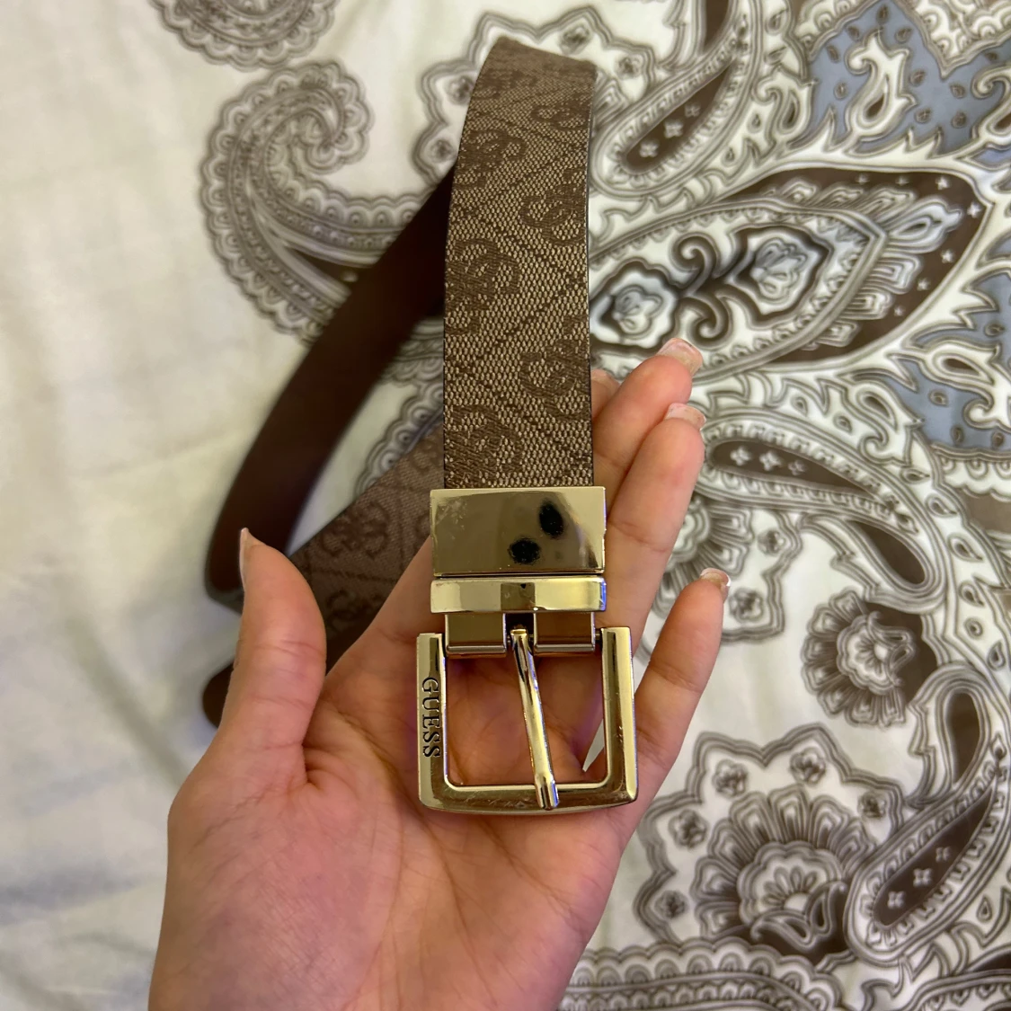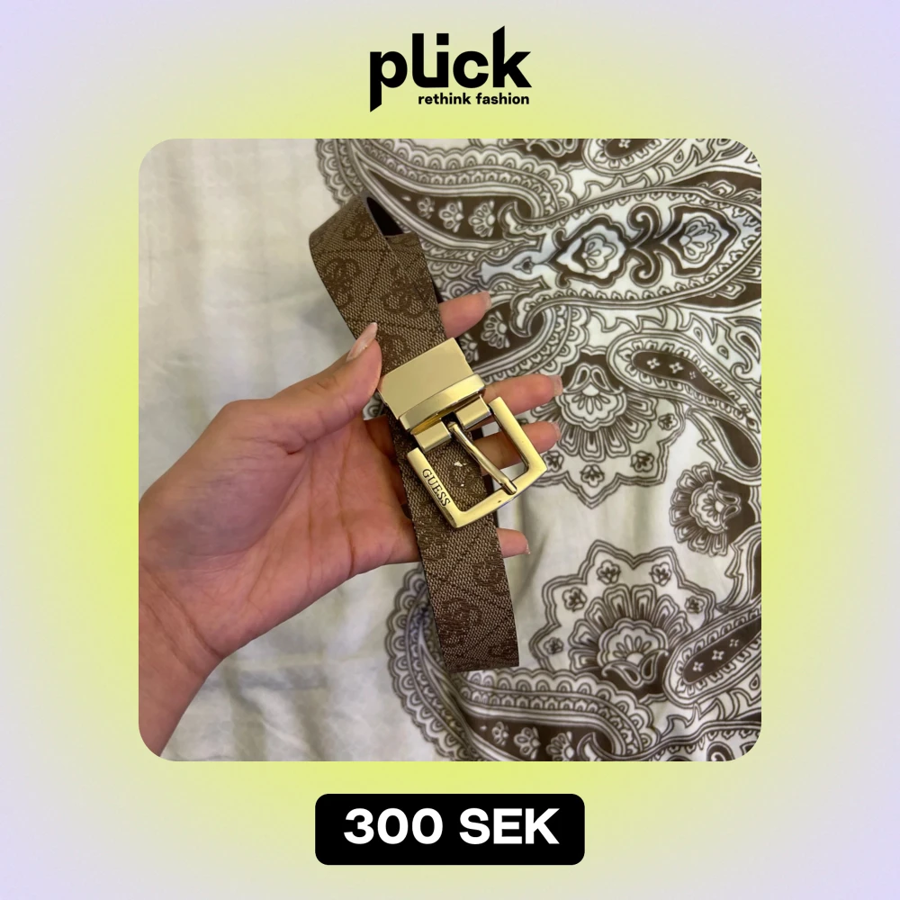 Säljer ett snyggt brunt äkta bälte från Guess med ett elegant mönster och en stilren guldspänne. Perfekt för att ge din outfit en lyxig touch. Bältet är i bra skick och passar till både vardag och fest. Ett måste för garderoben! Använd Max 2 gånger räckans som ny