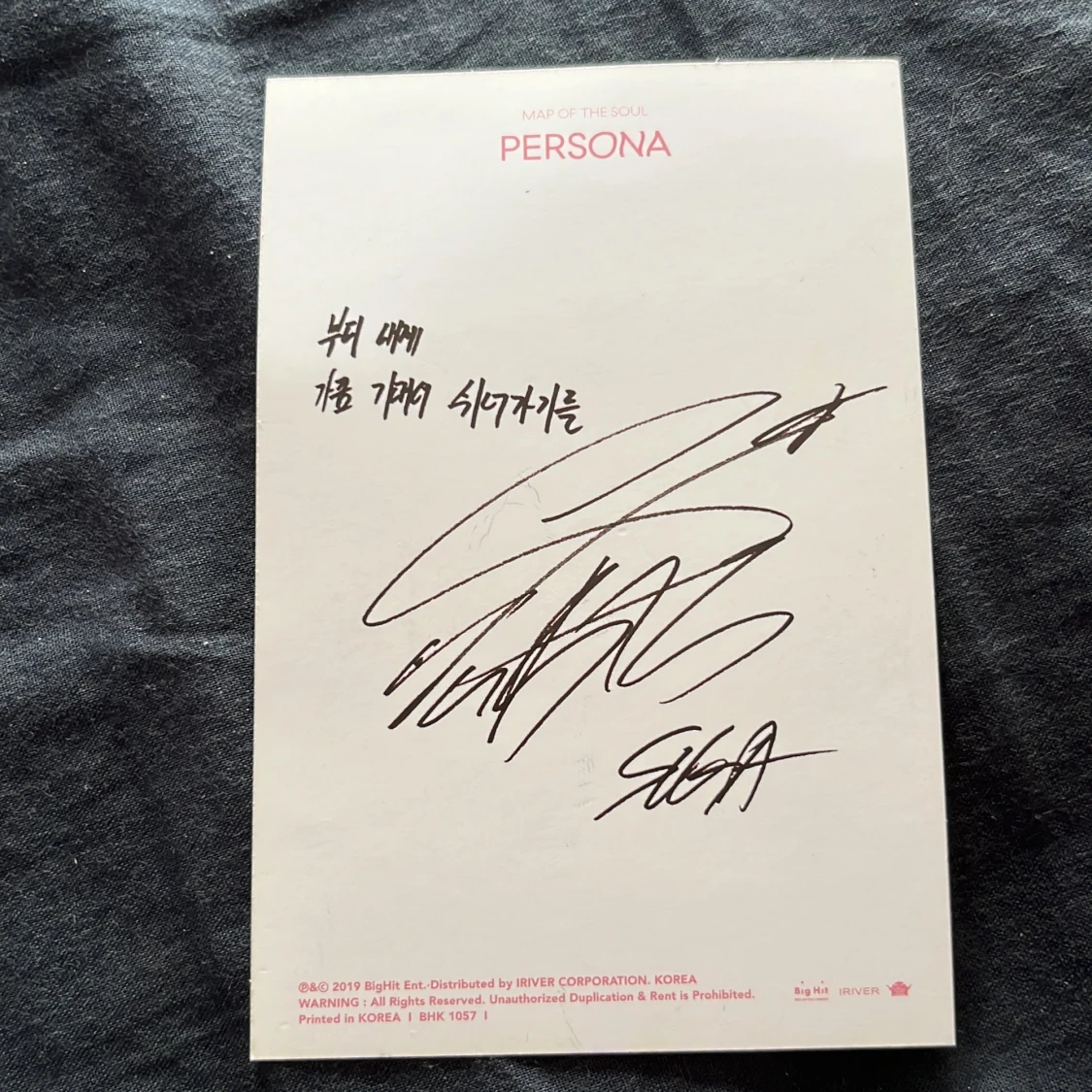 Från albumet Map of the soul: PERSONA (hälsning och signatur på baksidan av kortet)