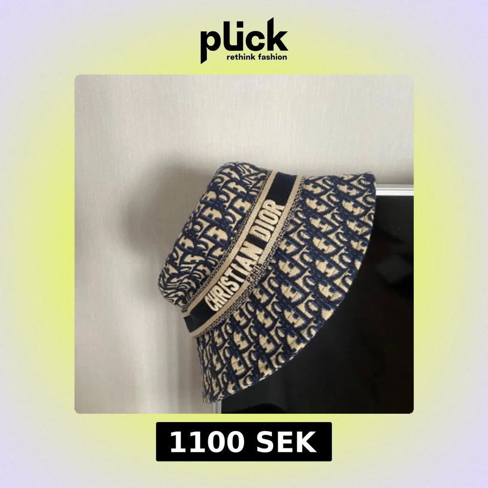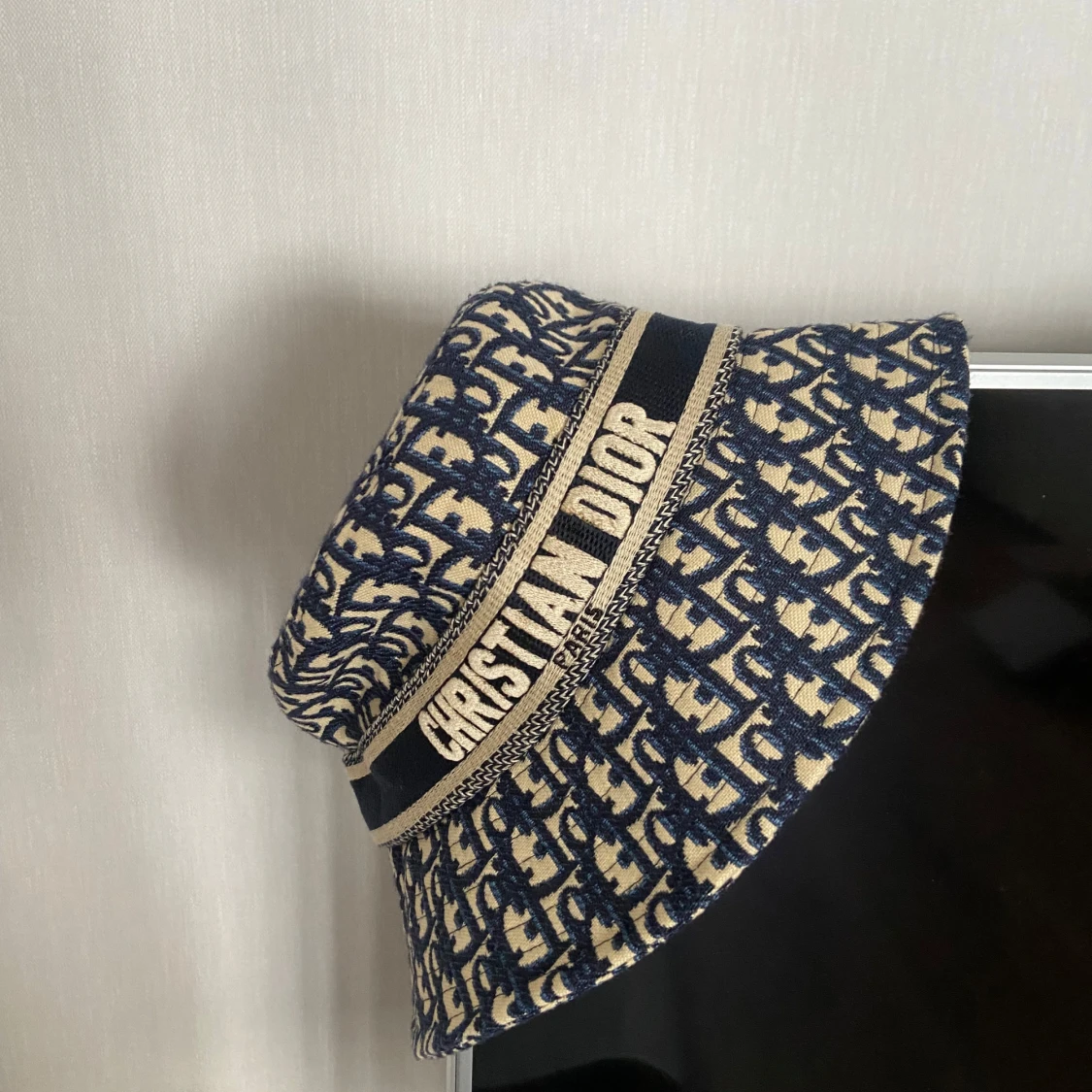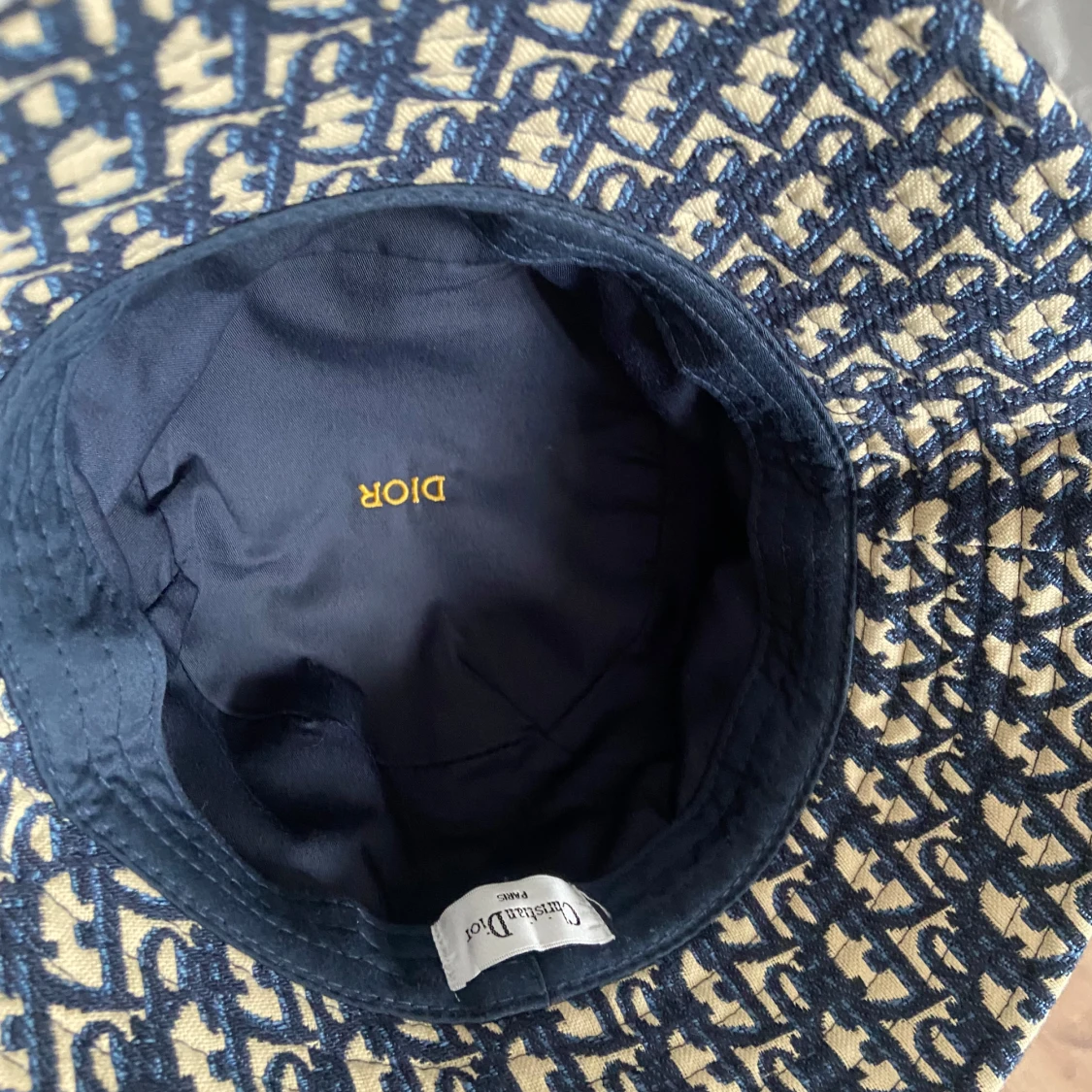 Säljer en exklusiv bucket hat från Christian Dior med blått och beige mönster samt tydlig logga runt hatten. Hatten har ett klassiskt snitt och är tillverkad i ett tyg med struktur. Perfekt accessoar för att lyfta din stil. Oanvänd