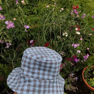Härlig bucket hat i rutigt tyg. Mycket unik då den är egensydd & dessutom med ett tyg som inte längre säljs! Frakt 22kr. Mått: omkrets 55 cm. :)