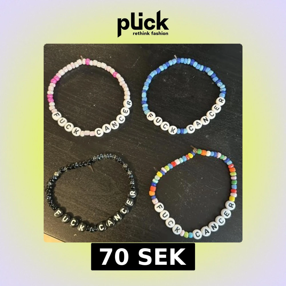Fyra armband med texten 'FUCK CANCER' i olika färger. Ett armband har rosa och vita pärlor, ett har blå pärlor, ett har svarta pärlor och ett har flerfärgade pärlor. Perfekt för att visa stöd och sprida medvetenhet. ❌blått finns tyvärr inte kvar❌ Går att köpa för sig eller alla. 20kr styck eller alla för 70kr😊💗