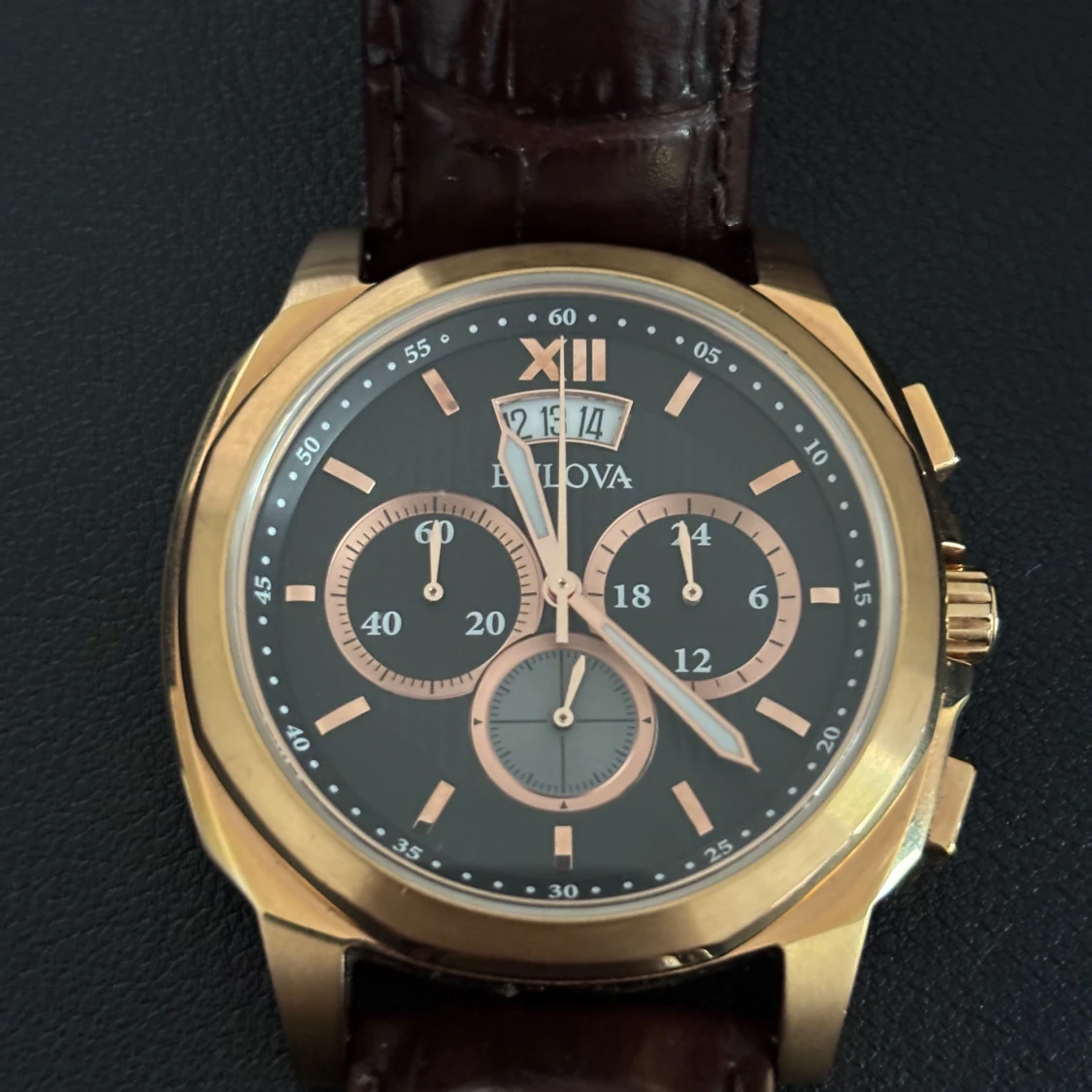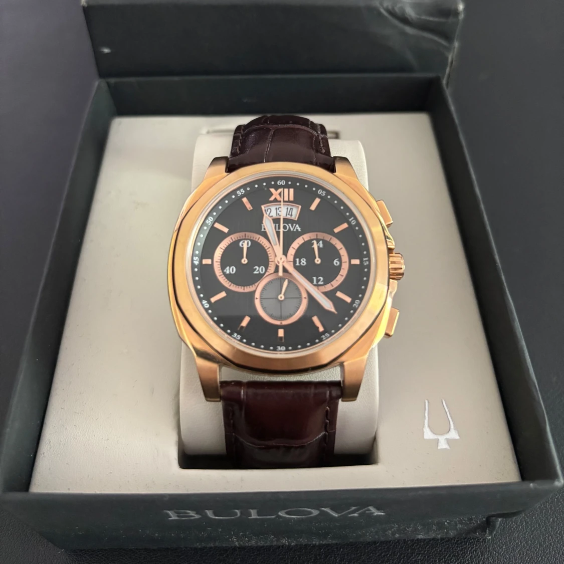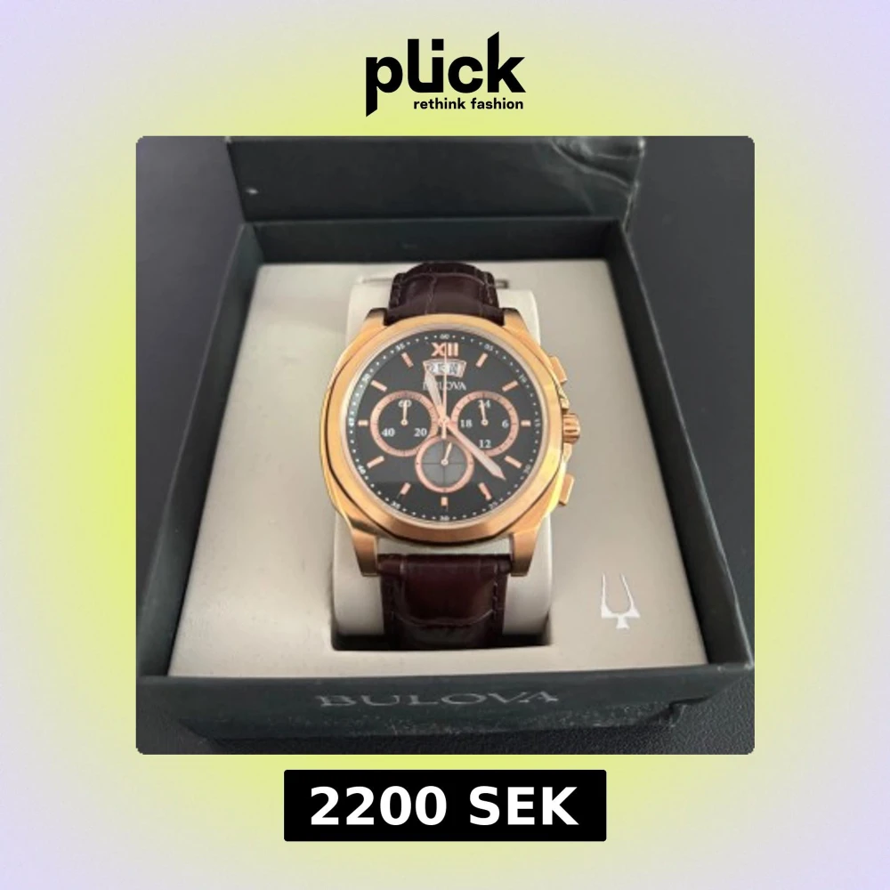 Stilren Bulova klocka med svart urtavla, roséguldfärgat boett och detaljer. Klockan har tre subdials, datumvisning och en klassisk brun läderrem med krokodilpräglad yta. Perfekt accessoar för dig som gillar en elegant och tidlös look. Nypris ~4000kr. Klocklådan ingår!
