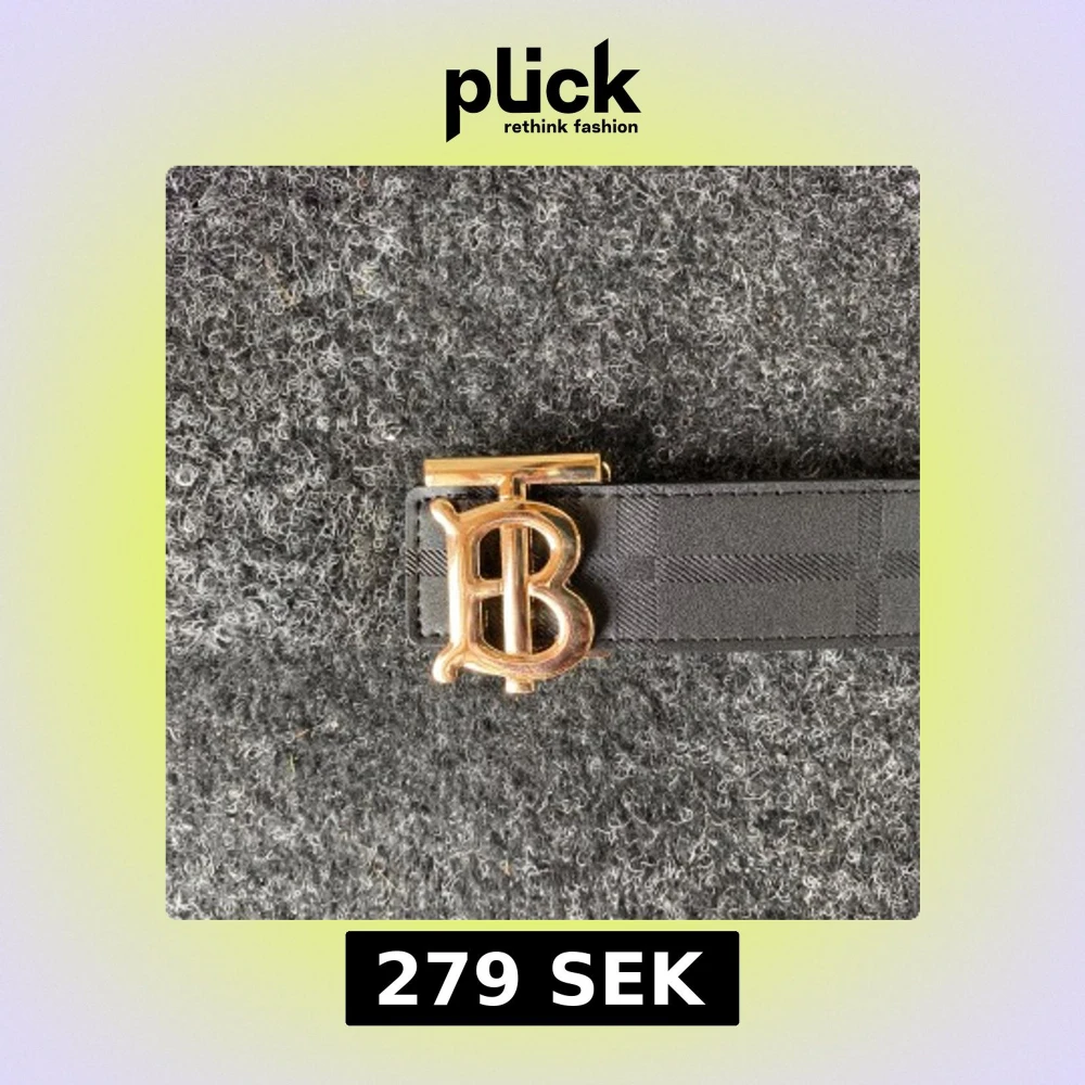 Snyggt vändbart bälte från Burberry med klassiskt rutmönster på ena sidan i beige, rött och grått, och diskret svart rutmönster på andra sidan. Spännet är i guld med Burberrys ikoniska TB-logo. Perfekt accessoar för att lyfta din outfit.