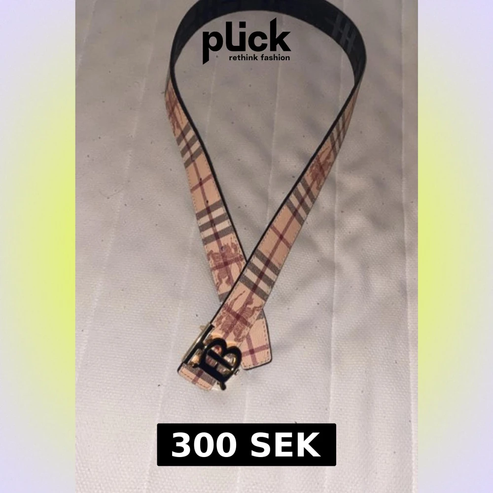 Snyggt vändbart bälte från Burberry med klassiskt rutigt mönster i beige, brun och röd på ena sidan och mörk svart med diskret mönster på andra. Spännet är i guld med TB-logga. Perfekt accessoar för att lyfta din outfit med lyxig känsla.