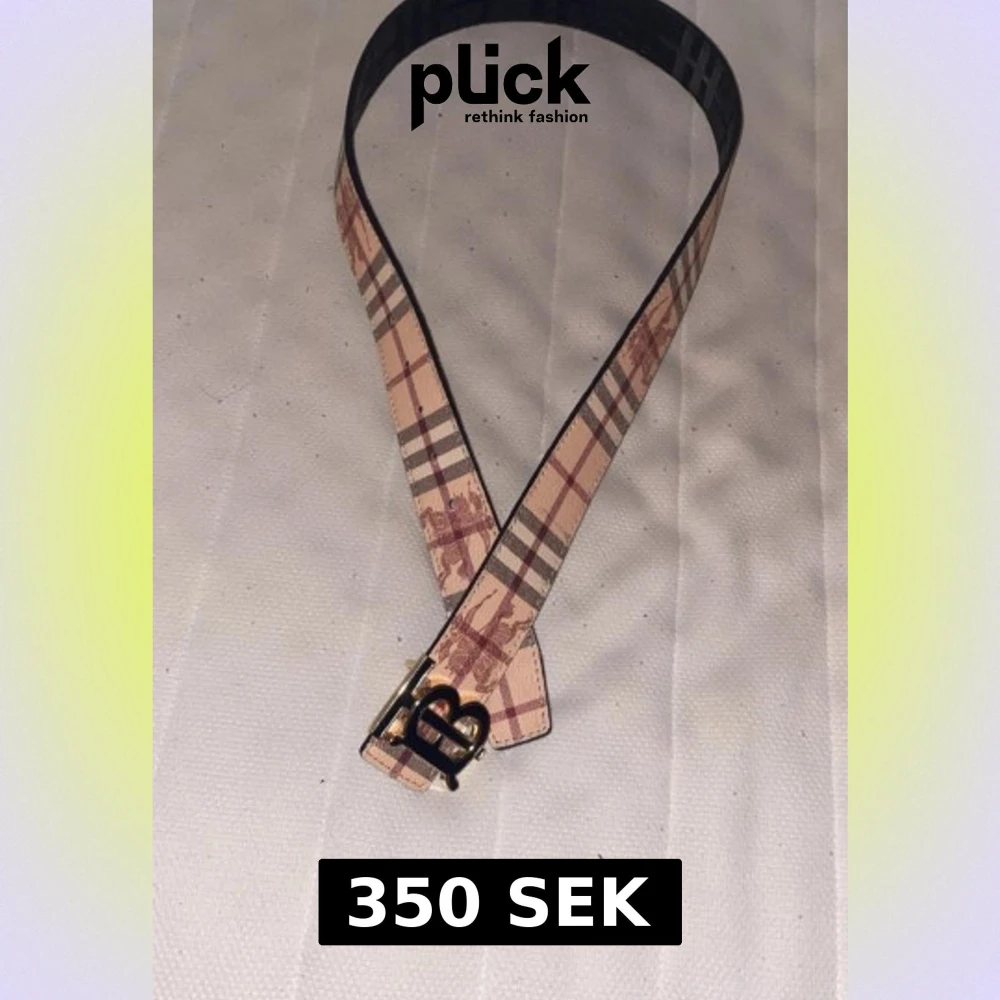 Säljer ett vändbart Burberry-bälte i skinn med klassiskt rutig mönster på ena sidan i beige, brun och röd, och svart med diskret relief på andra sidan. Snyggt TB-spänne i guld. Perfekt för att lyfta din outfit med en lyxig touch.