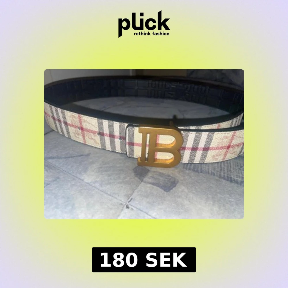 Snyggt Burberry bälte med klassiskt rutmönster i beige, svart och rött. Bältet har ett stort guldigt B-spänne framtill och är tillverkat i präglat läder. Perfekt för att lyfta din outfit med en lyxig touch.