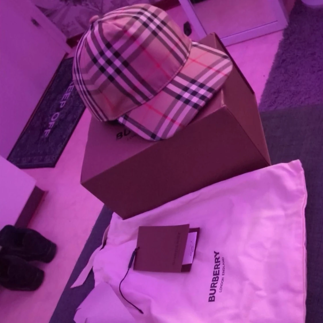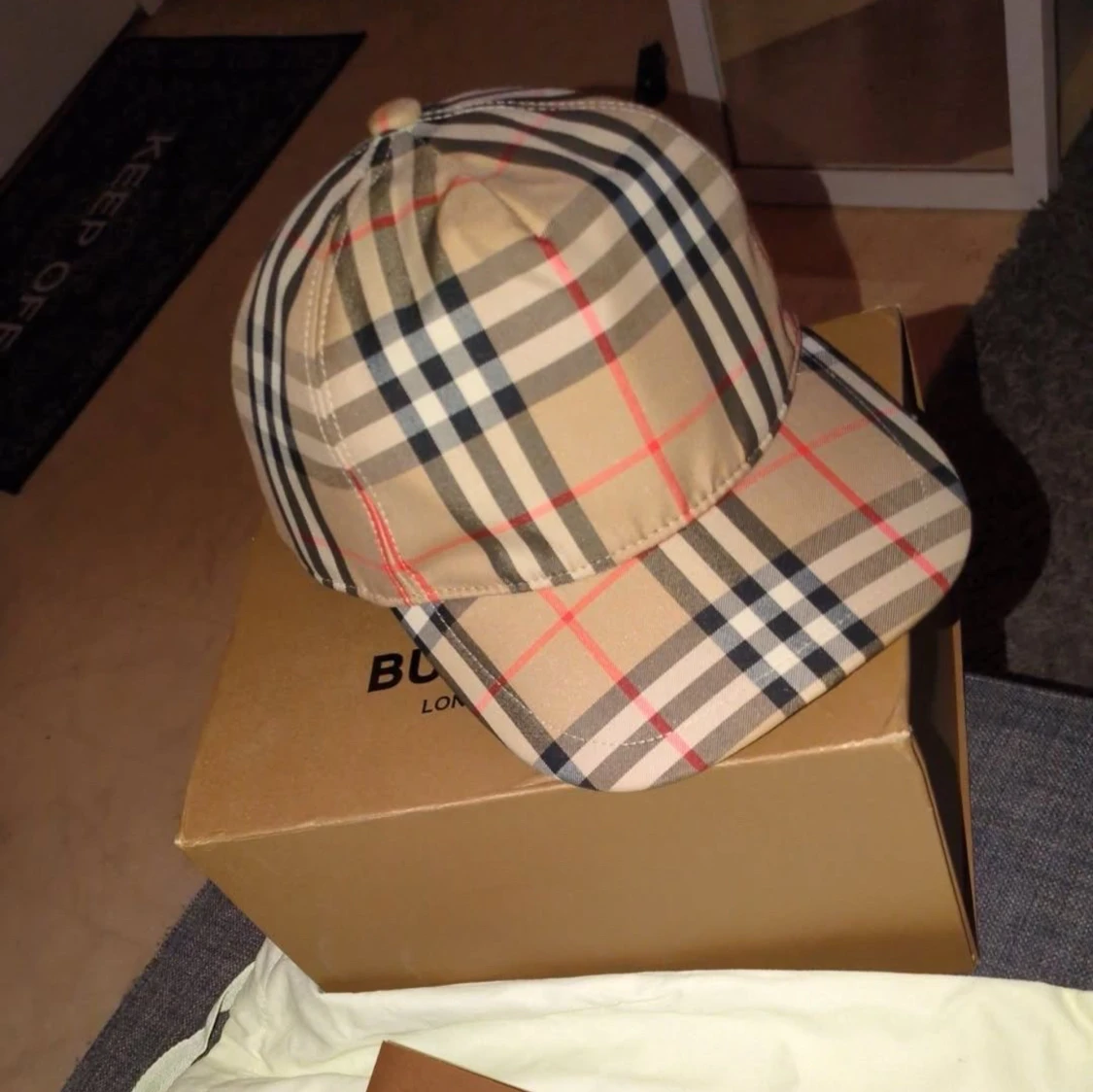 Snygg Burberry keps med klassiskt rutigt mönster i beige, svart, vitt och röda linjer. Kepsen har böjd skärm och justerbar passform. Materialet är mjukt och lätt, perfekt för dig som vill ha en ikonisk accessoar med street-vibe.