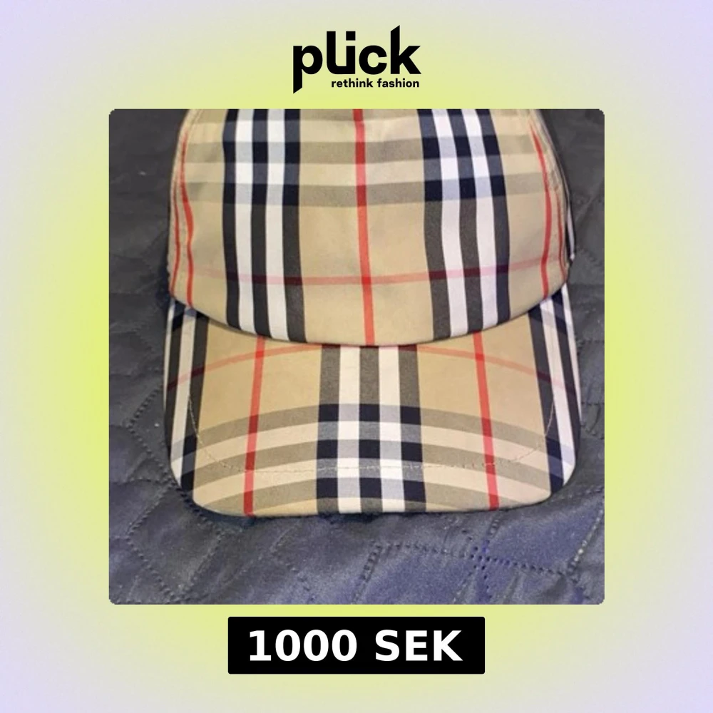 Snygg keps från Burberry med klassiskt rutigt mönster i beige, svart, vitt och röda linjer. Kepsen har böjd skärm och justerbar baksida med svart spänne. Tygpatch med 'Burberry London England' baktill. Perfekt accessoar för en trendig look.