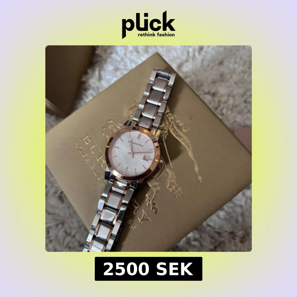Säljer en snygg Burberry klocka med länkarmband i silver och roséguld. Urtavlan är vit med diskret Burberry-mönster och datumvisning. Klockan har en rund form och klassisk design, perfekt för dig som gillar stilrena accessoarer. Aldrig använd.
