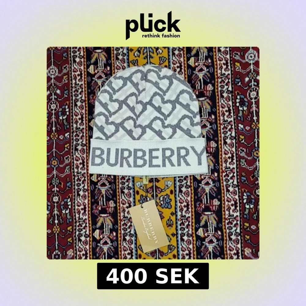 Vit mössa från Burberry med grått B mönster och stor logotyp framtill. Tillverkad i stickat material och har en uppvikt kant. Perfekt accessoar för att lyfta din stil.