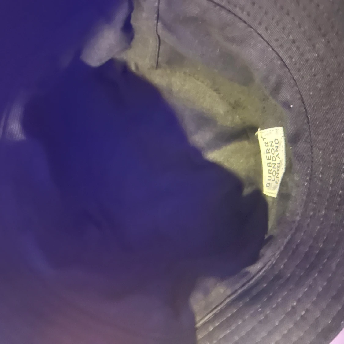 Säljer en vändbar bucket hat från Burberry. Ena sidan har klassiskt beige, svart, rött och vitt rutmönster, andra sidan är helsvart med vit Burberry-logga framtill. Hatten är i bomull och har en avslappnad passform. Perfekt för dig som vill ha två stilar i en.