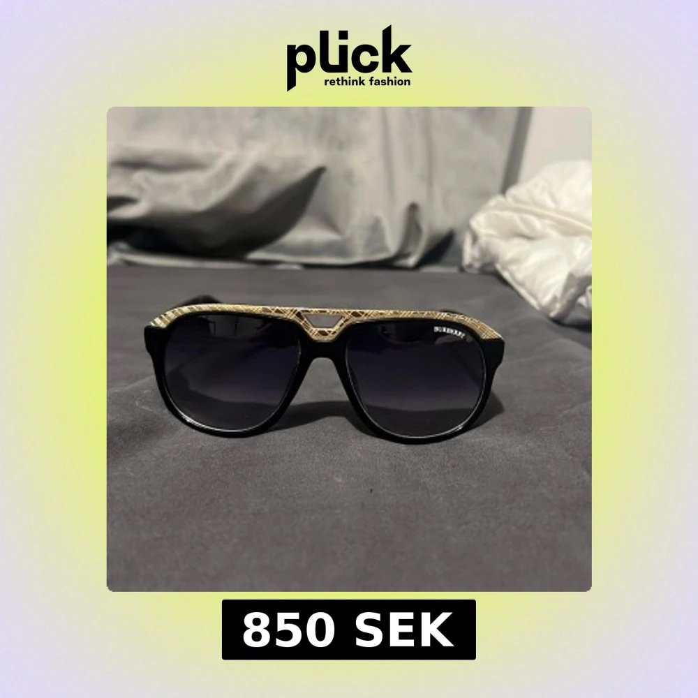 Snygga svarta solglasögon från Burberry med guldiga detaljer och klassiskt mönster på ovansidan av bågen. Modellen har en cool pilotform och mörka glas. Perfekt accessoar för att lyfta din stil och sticka ut i mängden.