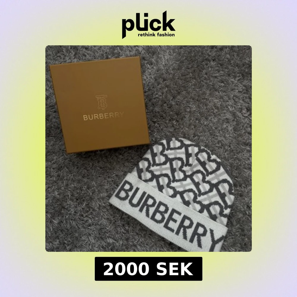 Snygg grå och vit mössa från Burberry med ett iögonfallande mönster av deras ikoniska logotyp. Mössan är stickad och har en bred kant med Burberrys namn i stora bokstäver. Perfekt för att hålla sig varm med stil.