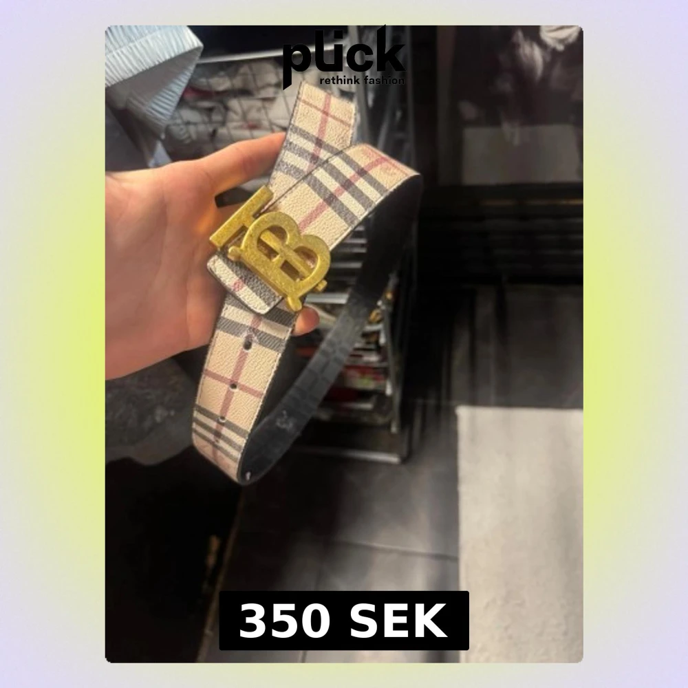 Snyggt Burberry bälte med klassiskt rutigt mönster i beige, svart och rött. Bältet har ett stort guldigt metallspänne med Burberrys ikoniska logotyp. Insidan är svart med präglat mönster och logga. Perfekt accessoar för att lyfta din outfit. Tror att de är 110cm