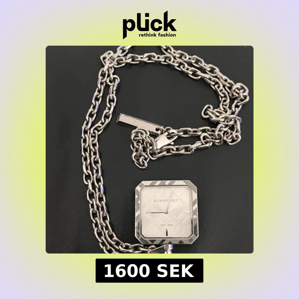 Säljer ett stilrent fickur från Burberry i silverfärgat metall med kedja. Klockan har fyrkantig urtavla med graverat mönster och diskreta index. Klassisk Burberry-logga och Swiss Made på urtavlan. Perfekt accessoar för dig som gillar lyxiga detaljer.