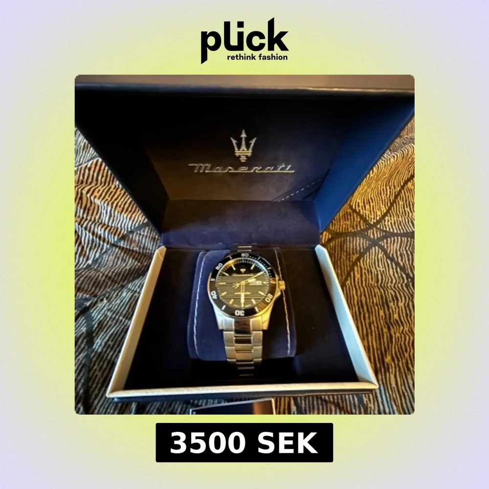 Snygg automatisk klocka från Maserati med svart urtavla och datumvisning. Köpte den i början av november 2025. Funkar felfritt, bara hittade en annan klocka jag gillade mer. Klockan har en robust länk i silverfärgat stål och levereras i originalbox med extra länkbitar. Sportig design med tydliga siffror på vridringen och Maserati-logga på urtavlan. Du får med alla storlekar, så du kan ändra ifall du vill. Kvittot kommer med så att du vet att du har fått ett bra pris för klockan.