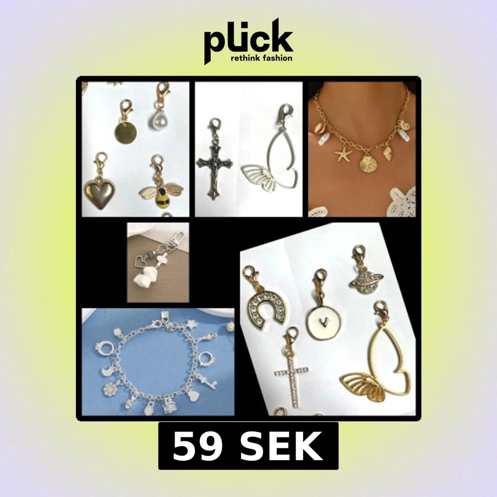 Häng på mobilen, väskan, skorna, fickan, armbandet, nyckelringen eller halsbandet… Finns många olika trendiga berlocker i guld, perfekta till halsband eller armband. Motiven är fjäril, stjärna, måne, kors, hjärta, blomma, planet, hästsko, snäcka, mynt, fyrklöver och mer. Vissa har glittriga stenar, andra är emaljerade eller med pärldetalj. Gäller 1 st