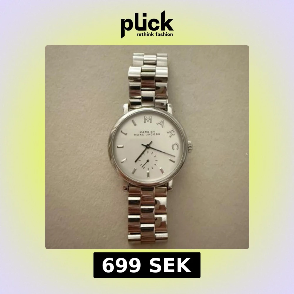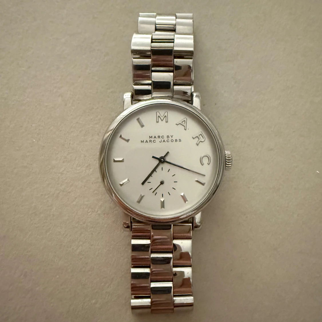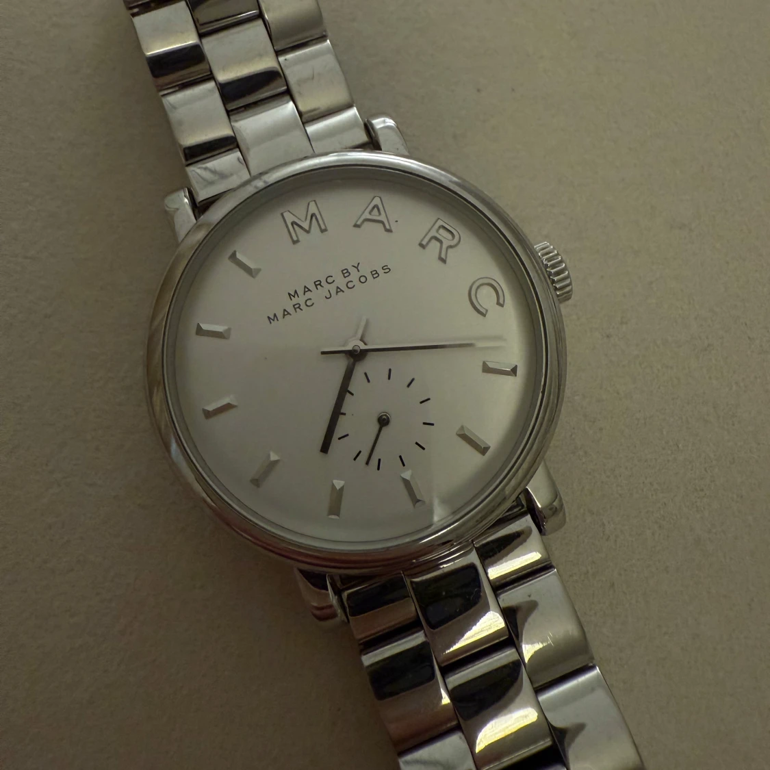Elegant silverfärgad klocka från Marc Jacobs med vit urtavla och stilrena indexmarkeringar. Klockan har en klassisk länkarmband i metall och en subtil sekundvisare. Perfekt för en stilren look! Batteriet behövs dock bytas ut ❣️