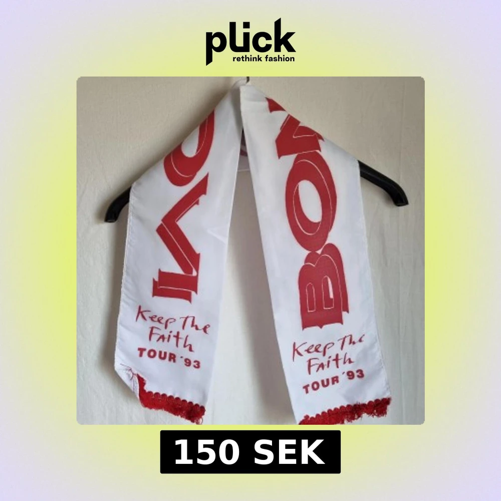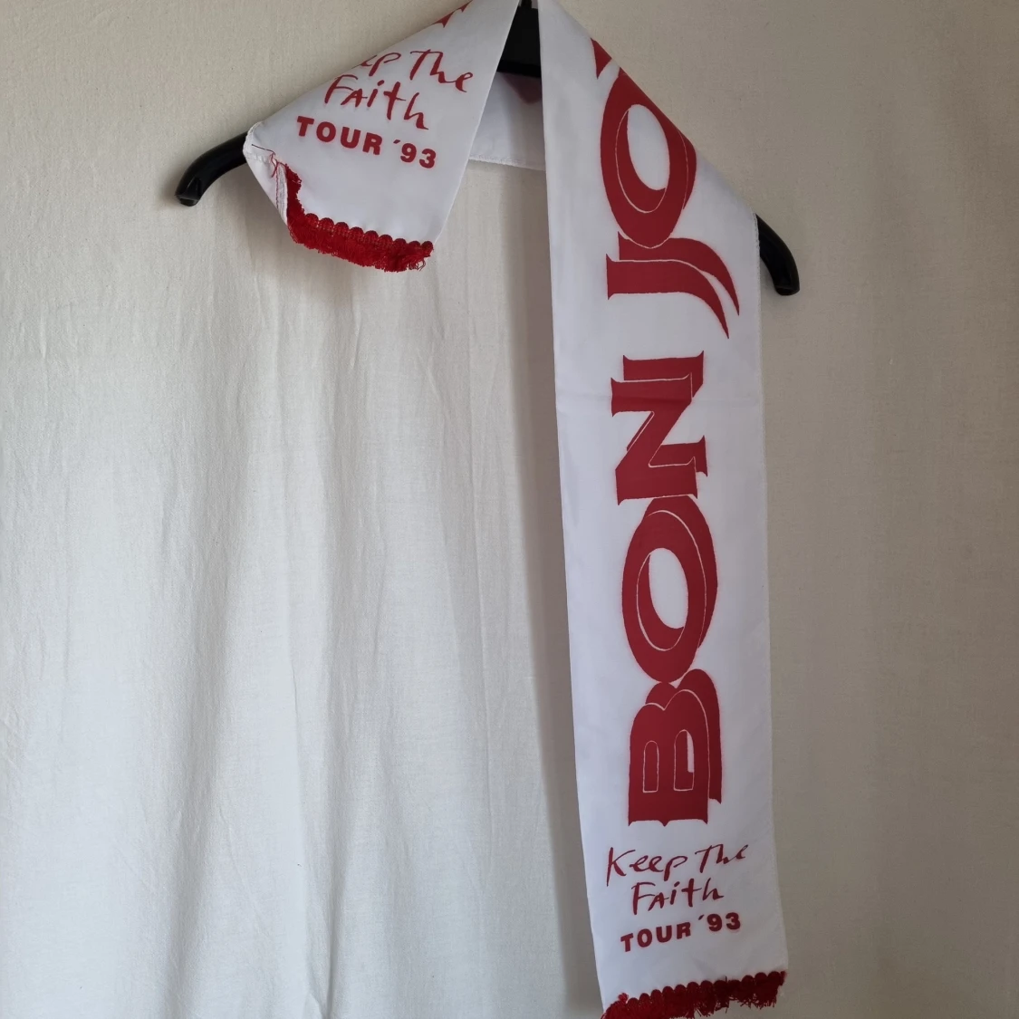 Snygg vit halsduk med röd text 'Keep The Faith TOUR '93' och 'BON JOVI'. Den har röda fransar i ändarna som ger en cool touch. Perfekt för fans av bandet!
