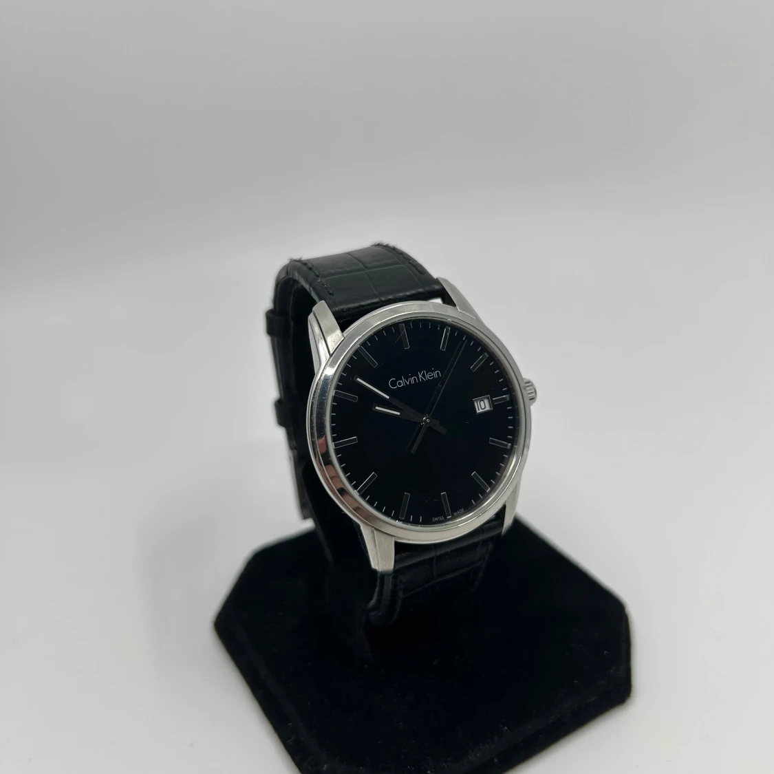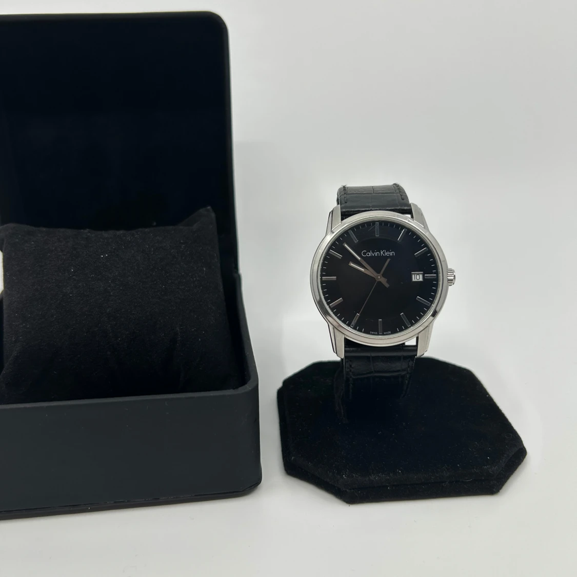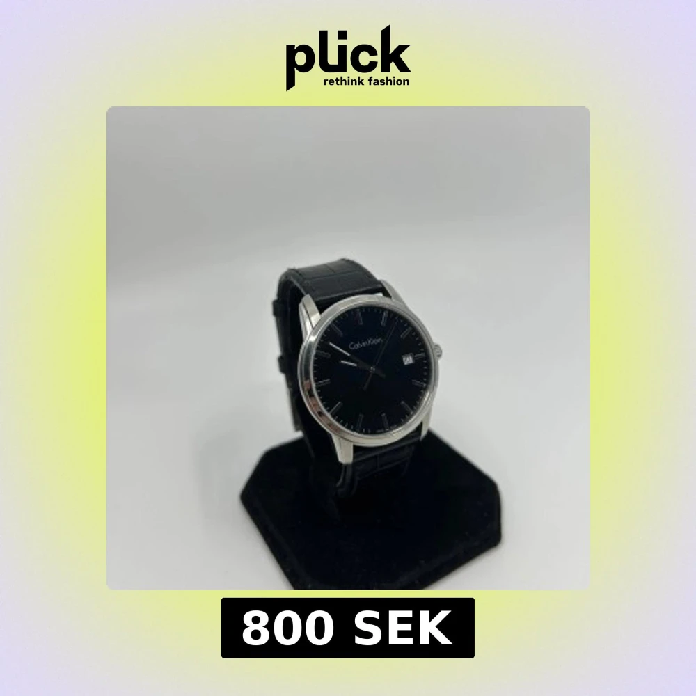 Stilren klocka från Calvin Klein med svart urtavla och datumvisning. Boetten är i silverfärgad metall och armbandet är svart med läderlook och diskret mönster. Perfekt accessoar för en clean och modern stil.