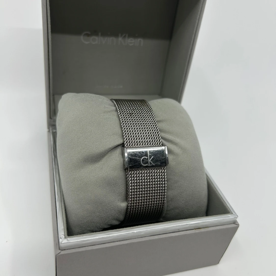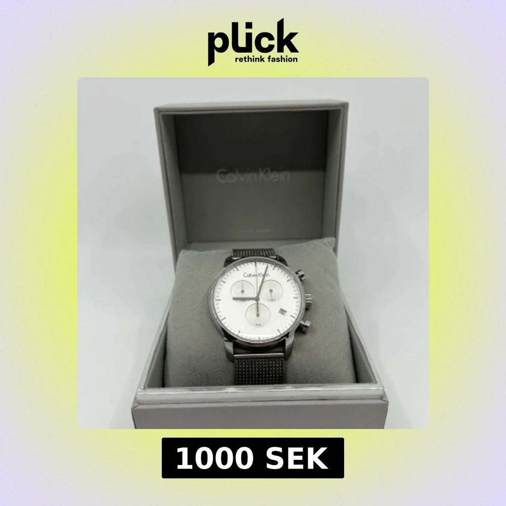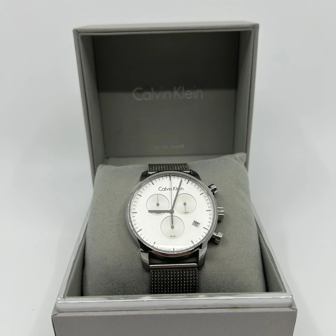 Stilren klocka från Calvin Klein med rund vit urtavla, tre subdials och datumvisning. Armbandet är i silverfärgat meshstål med diskret CK-logga på spännet. Kommer i originalask, perfekt för dig som gillar minimalistisk design och snygga detaljer.