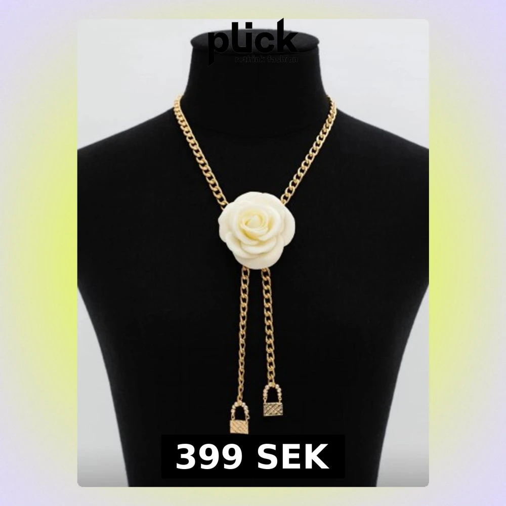 Simple and elegant. Can be used in many ways like choker and necklace also can be worn as belt . The camellia flower is inspired by Ch@nel and can be pin as a broach.
