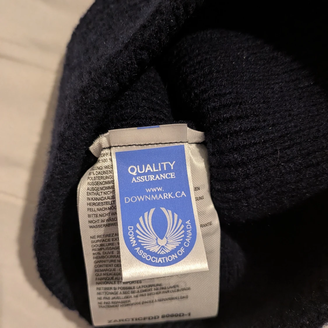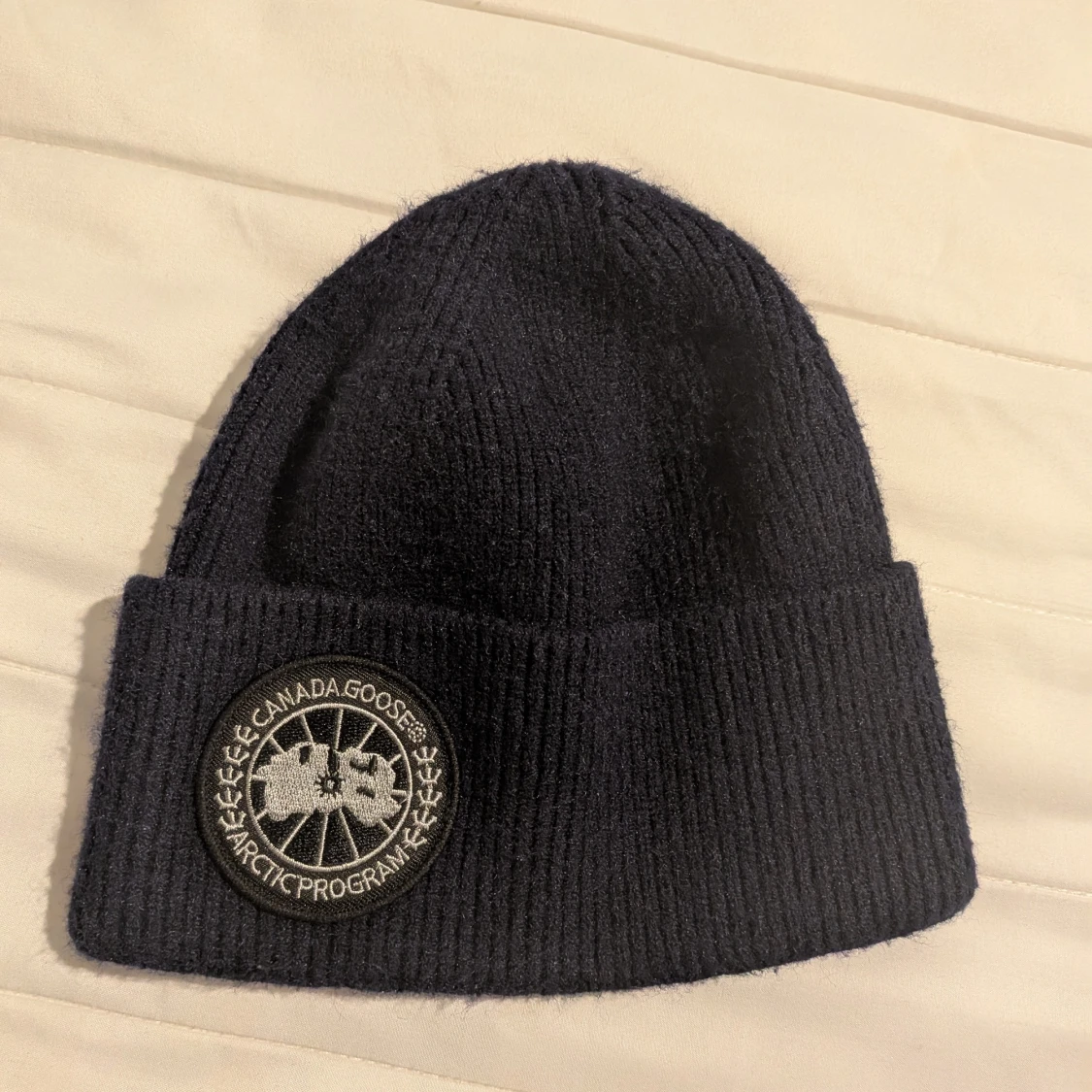 Ribbstickad mörkblå mössa från Canada Goose med klassisk rund logotyp-patch framtill. Tillverkad i en mjuk ullblandning som håller dig varm under kalla dagar. Perfekt accessoar för vintern och snygg till alla ytterkläder.