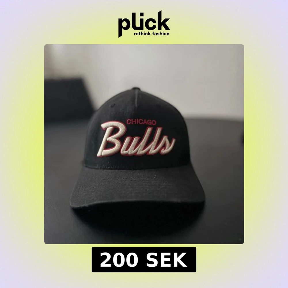 Svart keps med böjd skärm och broderad Chicago Bulls-logga i vitt och rött framtill. Sidan har Bulls-symbolen i rött och vitt, och baktill står Mitchell & Ness broderat. Justerbar snapback. Perfekt för dig som gillar basket och streetwear.