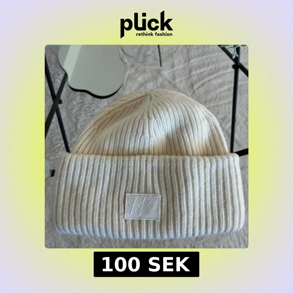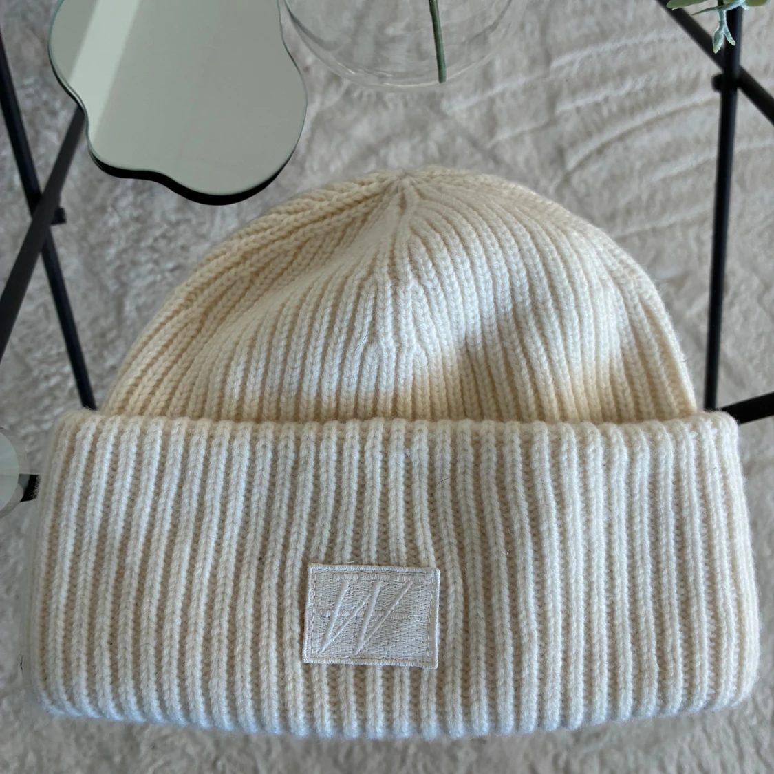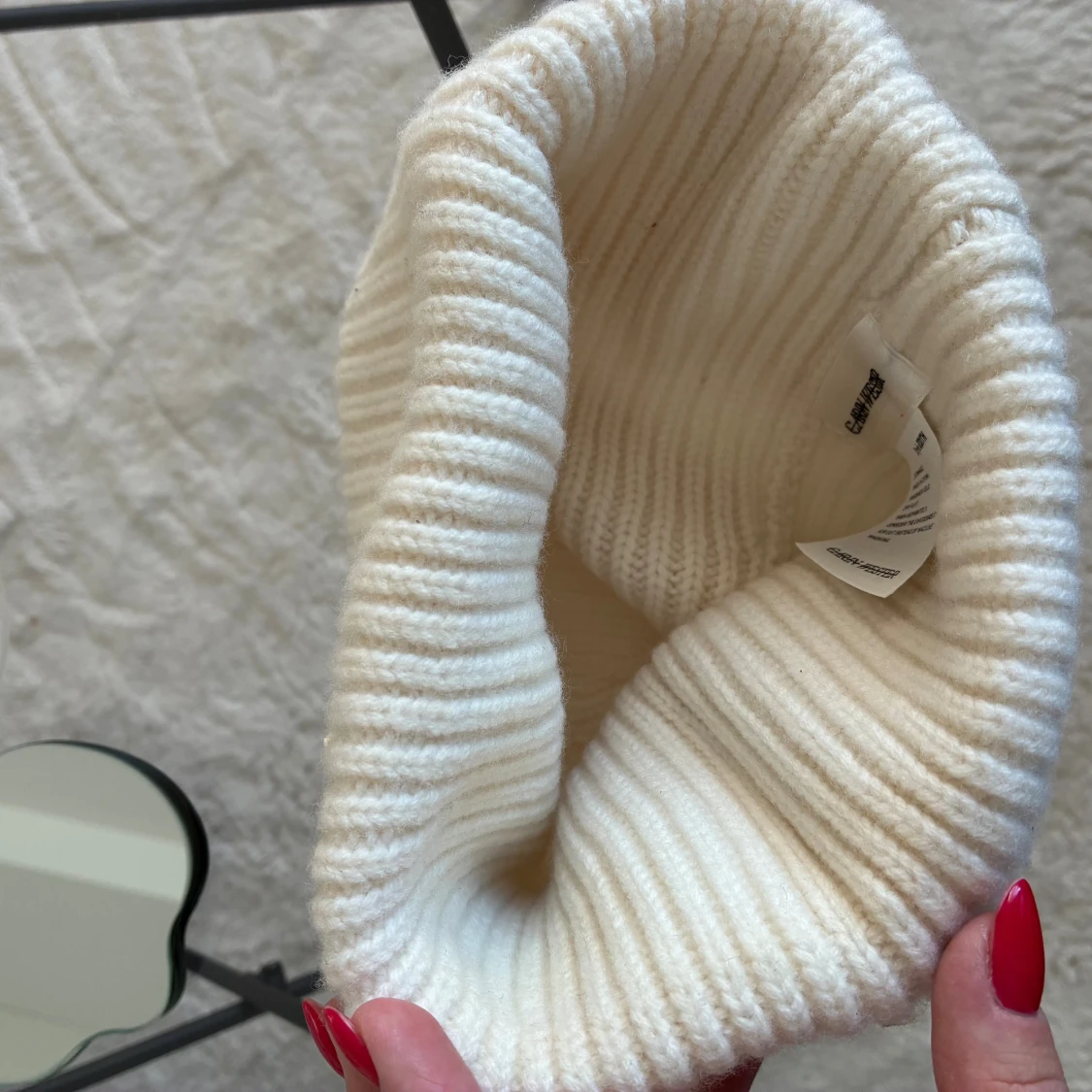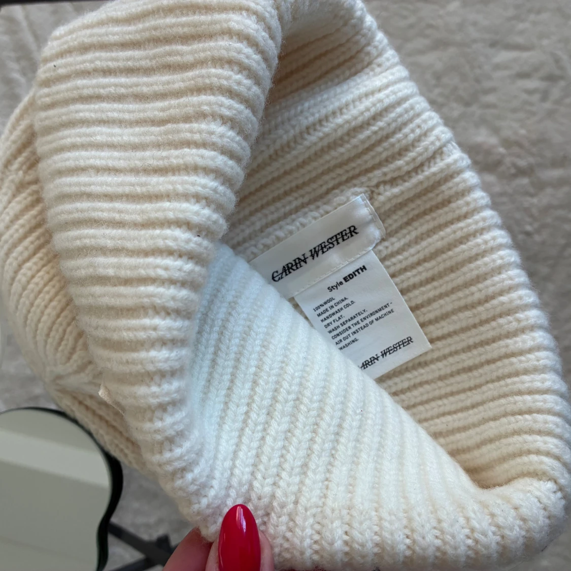 Snygg vit ribbstickad mössa från Carin Wester, modell Edith.