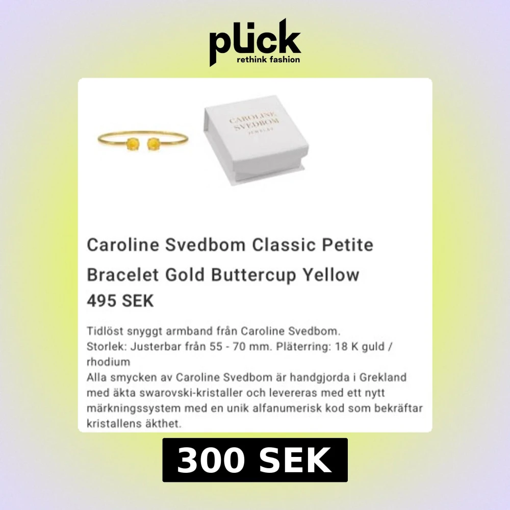 Snyggt och stilrent armband från Caroline Svedbom med 18K guldplätering och två klara, gula swarovski-kristaller. Justerbar storlek mellan 55-70 mm. Levereras i original ask med logga. Perfekt för dig som gillar exklusiva detaljer och färg.