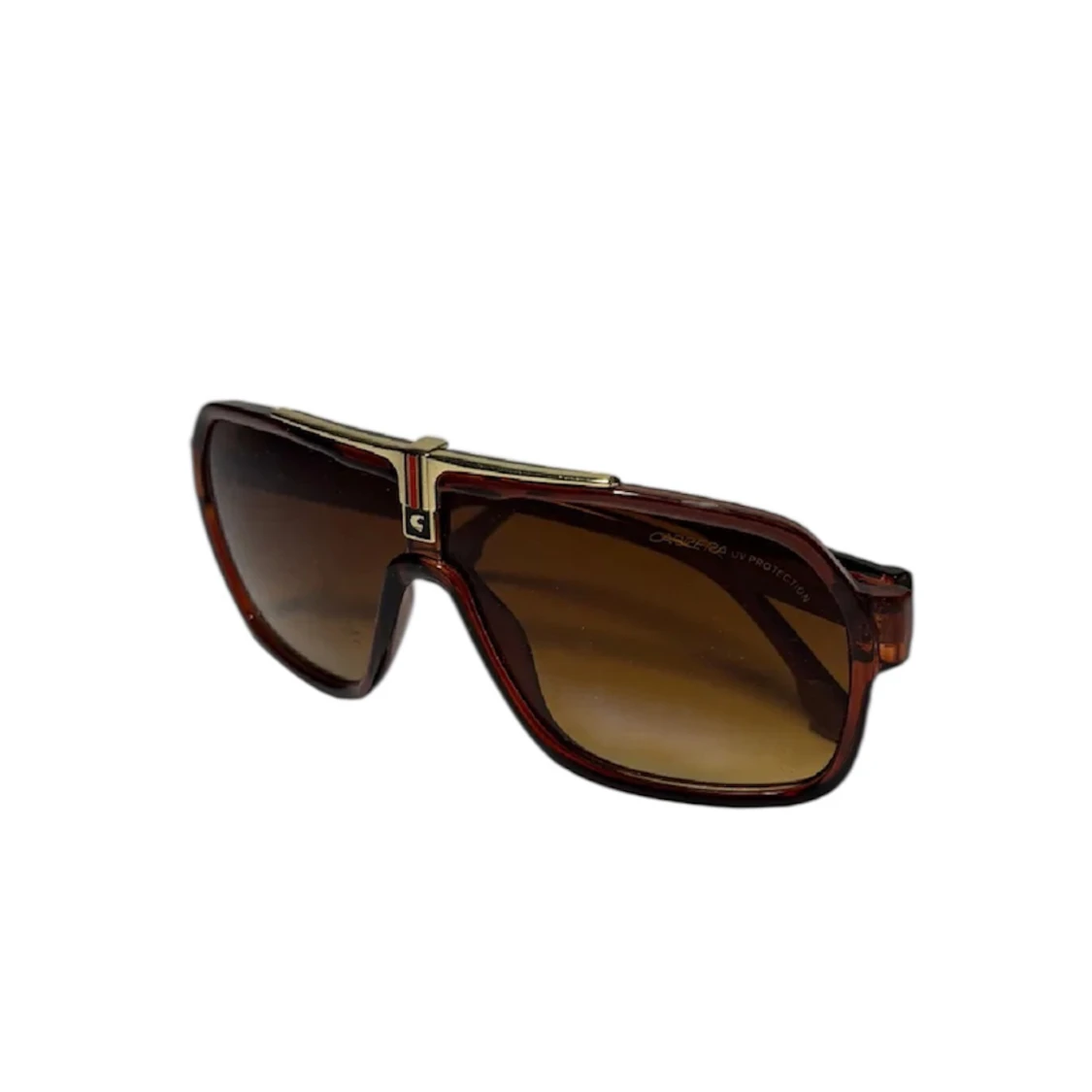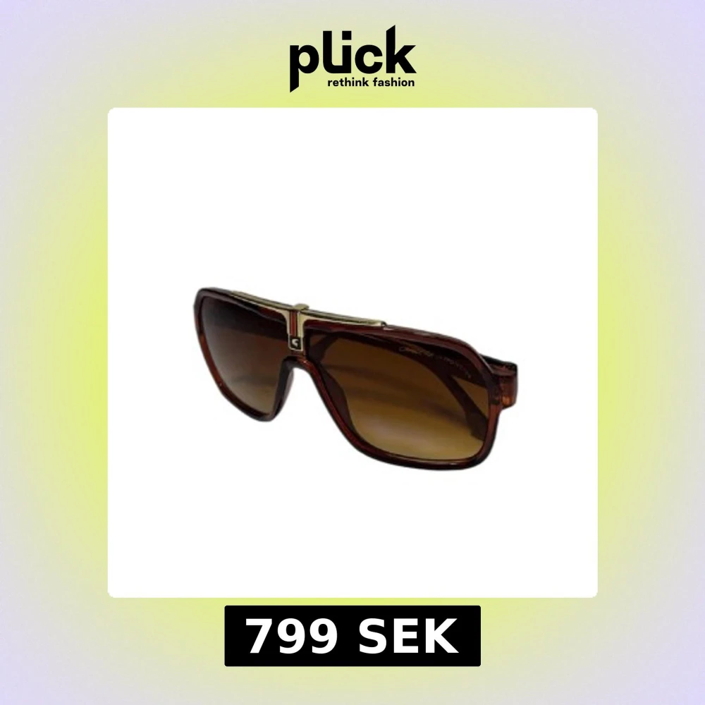 Snygga solglasögon från Carrera med brun transparent båge och guldiga detaljer på ovansidan. Glasen är tonade i brunt och modellen har en sportig, retroinspirerad form. Perfekta för dig som vill sticka ut ut mängden med ett par riktigt feta solglasögon. Nypris 1500 kr + hör av er vid funderingar kring pris eller annat !