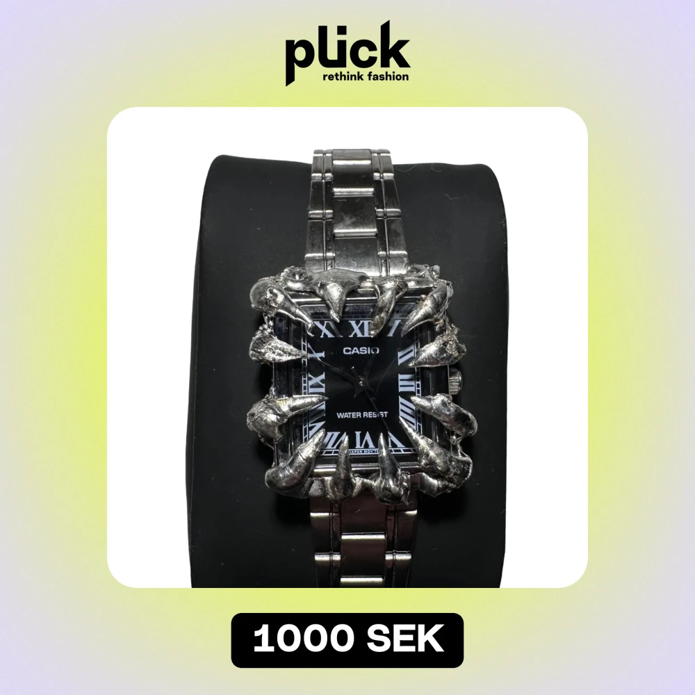 Säljer en cool Casio klocka med ett unikt och edgy armband. Klockan har en svart urtavla med romerska siffror och är vattenresistent. Armbandet är i silverfärg och har en tuff design som ser ut som klor runt urtavlan. Perfekt för dig som vill sticka ut!