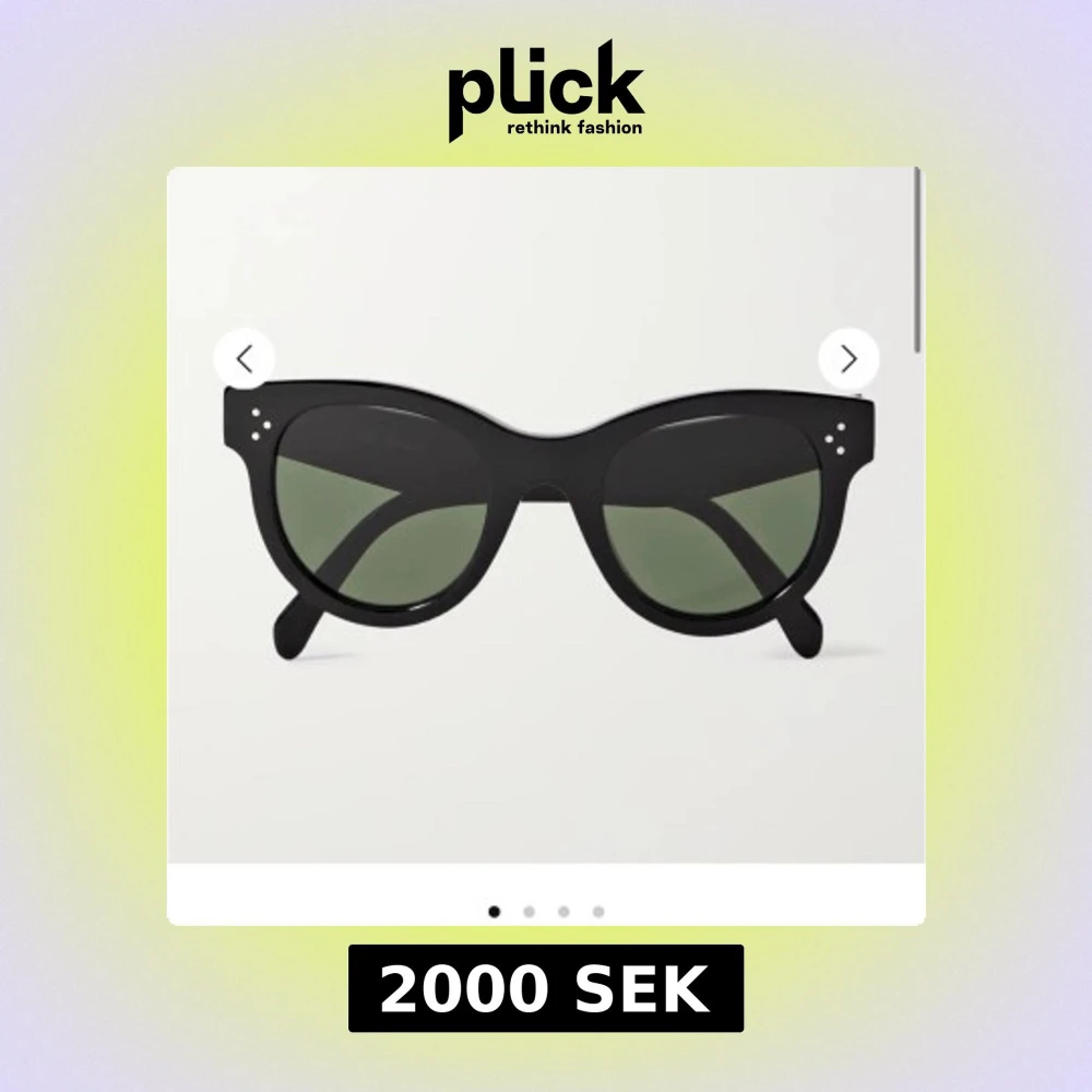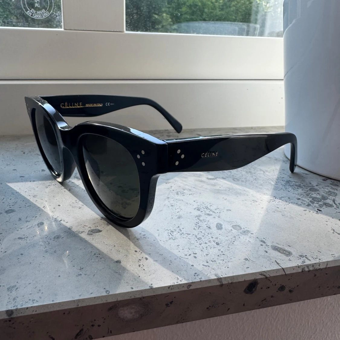 Snygga svarta solglasögon från Céline med rundad cat-eye form och gröntonade linser. Bågarna är i blank acetat med ikoniska silverprickar vid fronten. Perfekt accessoar för en cool och stilren look.